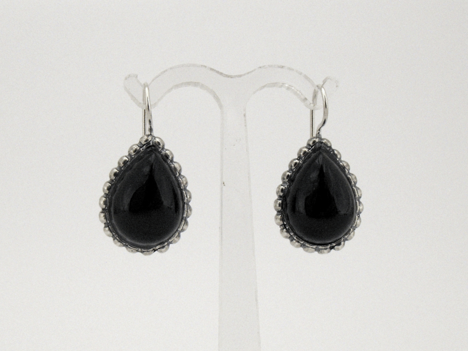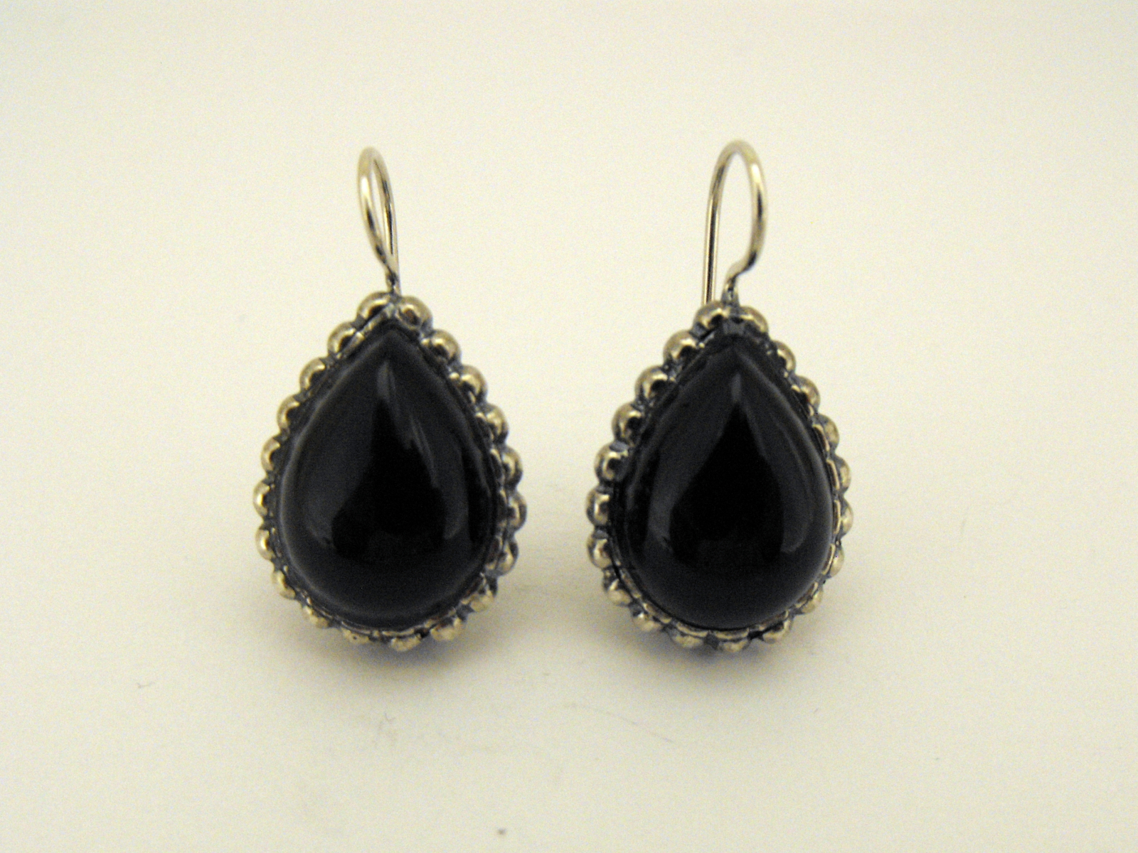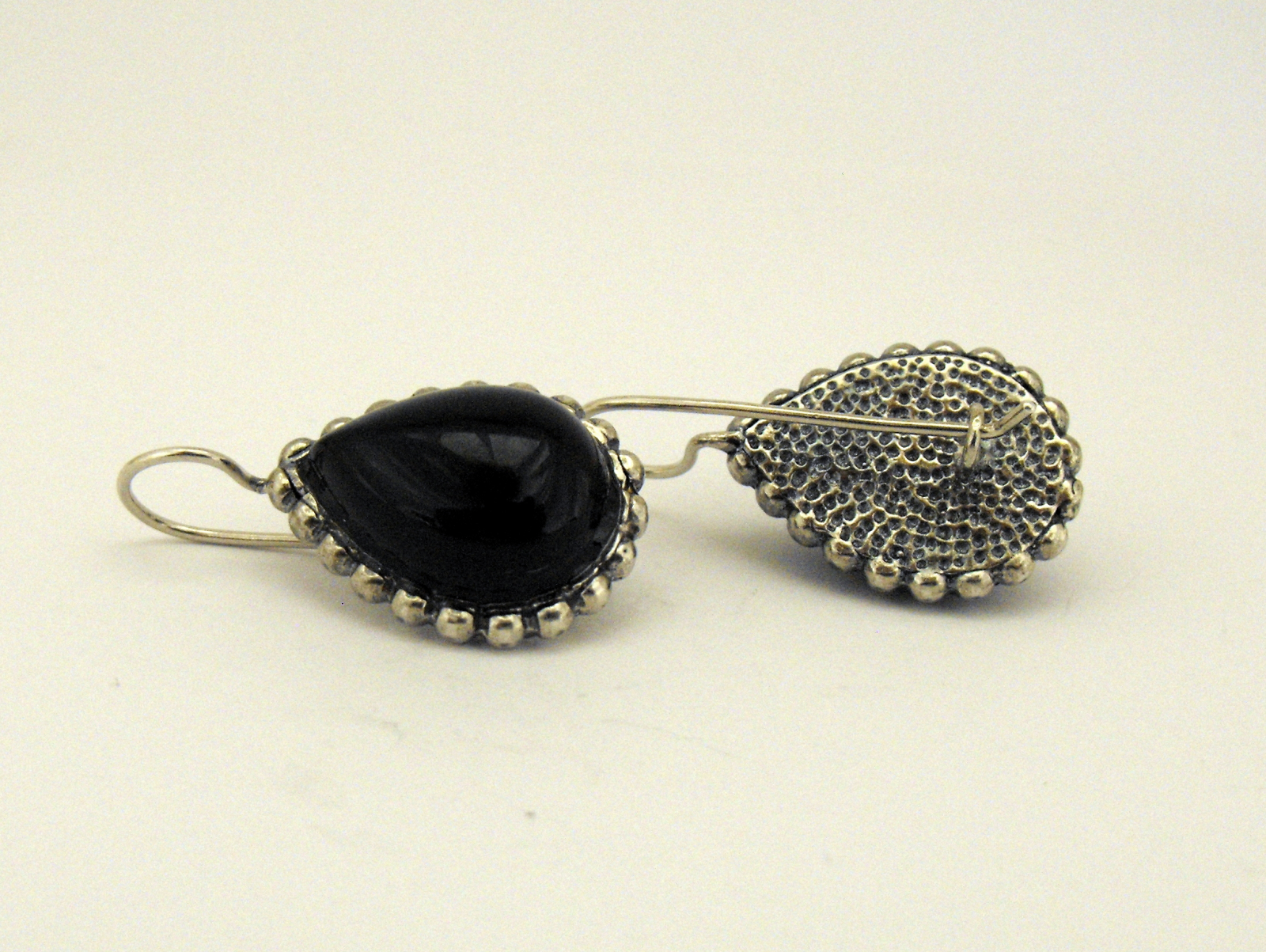 Cercei realizati manual din argint. Marginea casetei in forma de sirag de margele este accentul care scoate cercelul din banal. Volumul si dimensiunea onixului atrage privirea.