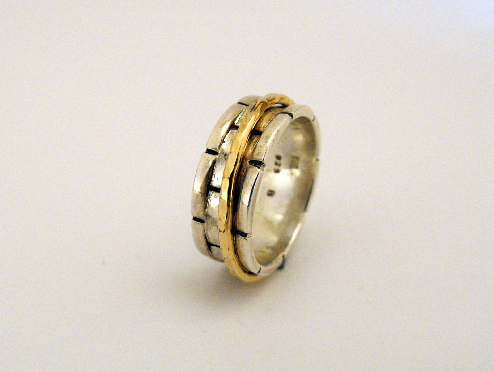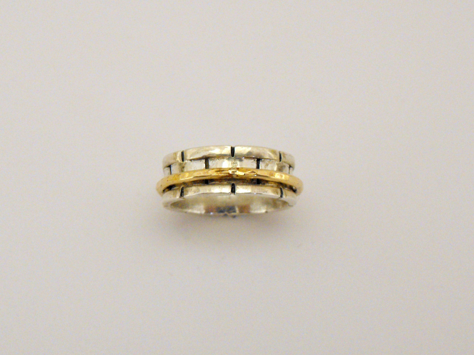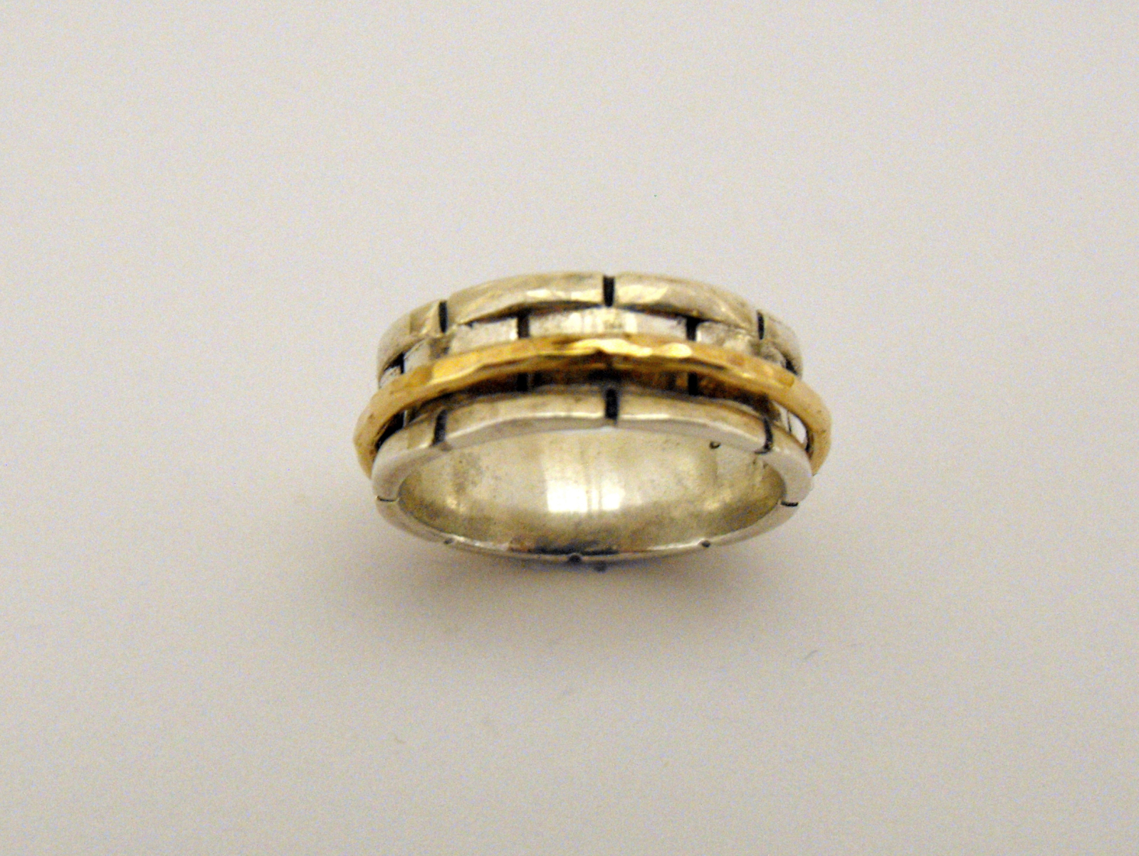 Inel moving unisex lucrat manual. Baza si marginile canelate ale inelului au striatii oxidate cu aspect de zidarie.Veriga jucausa din gold filled schimba cu totul aceasta perceptie.Designul acestui inel il face potrivit si pentru a fi purtat ca verigheta.