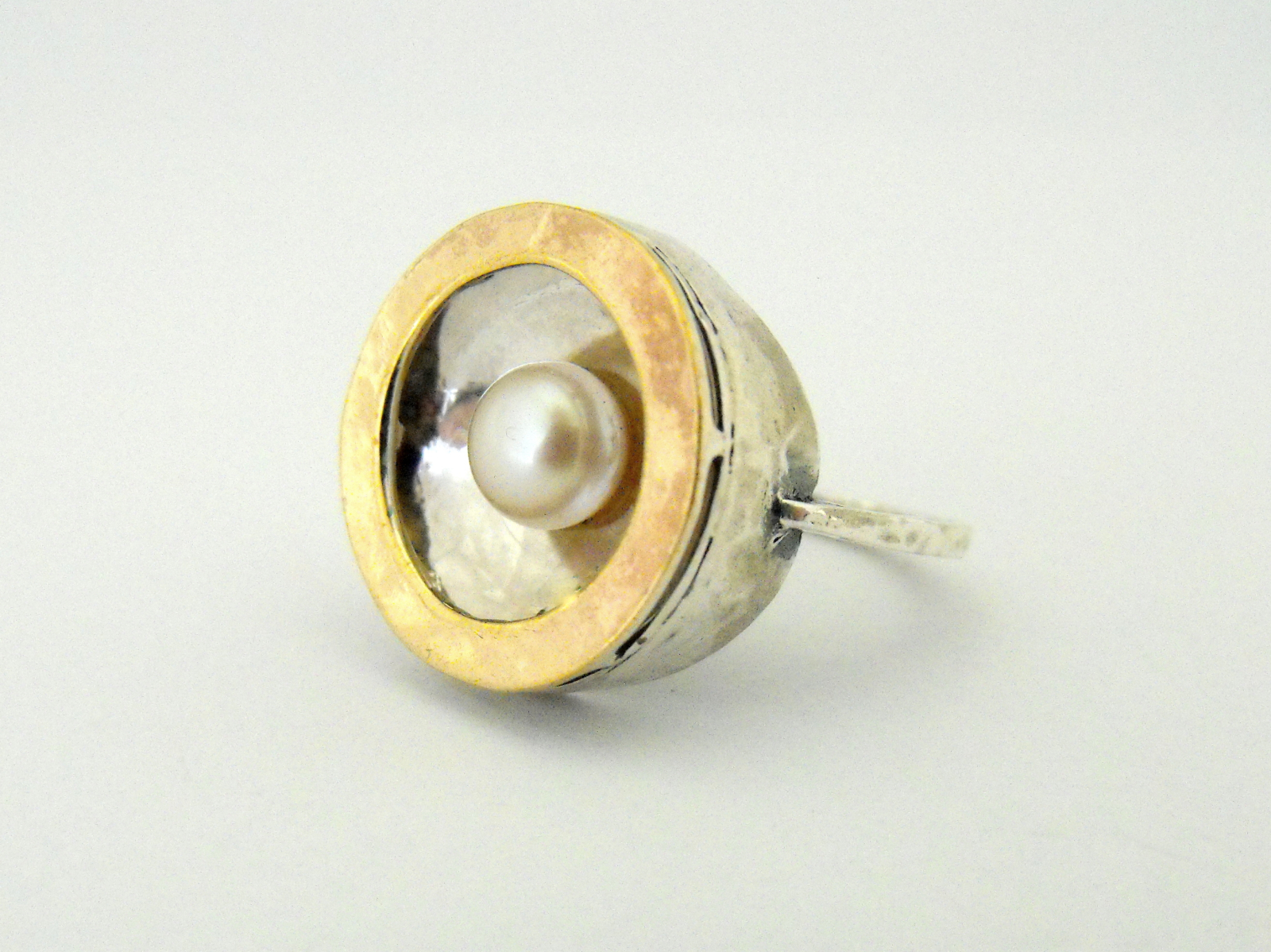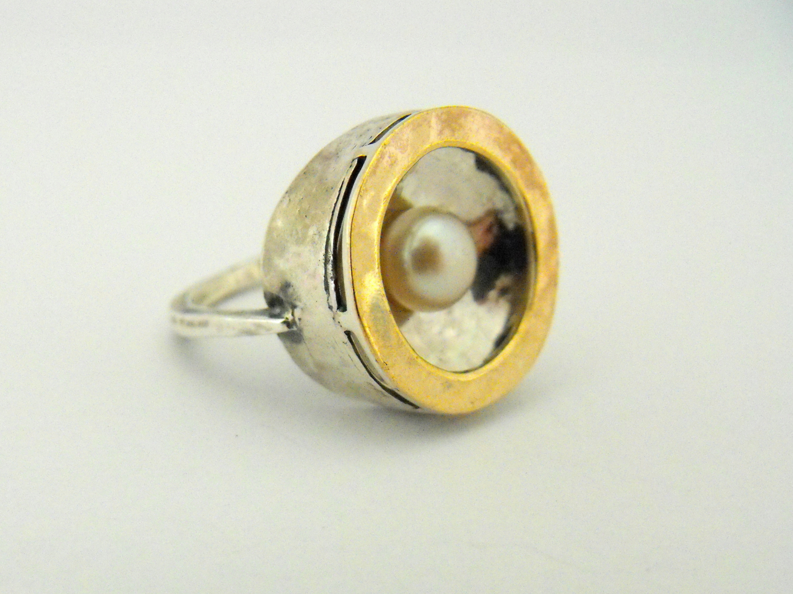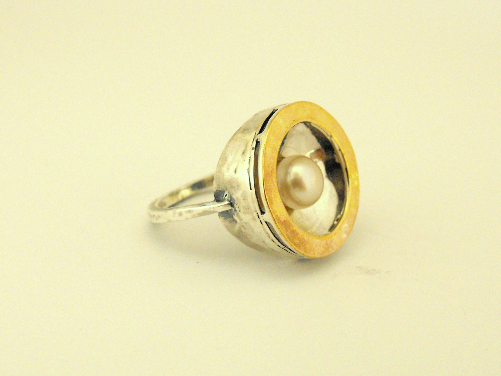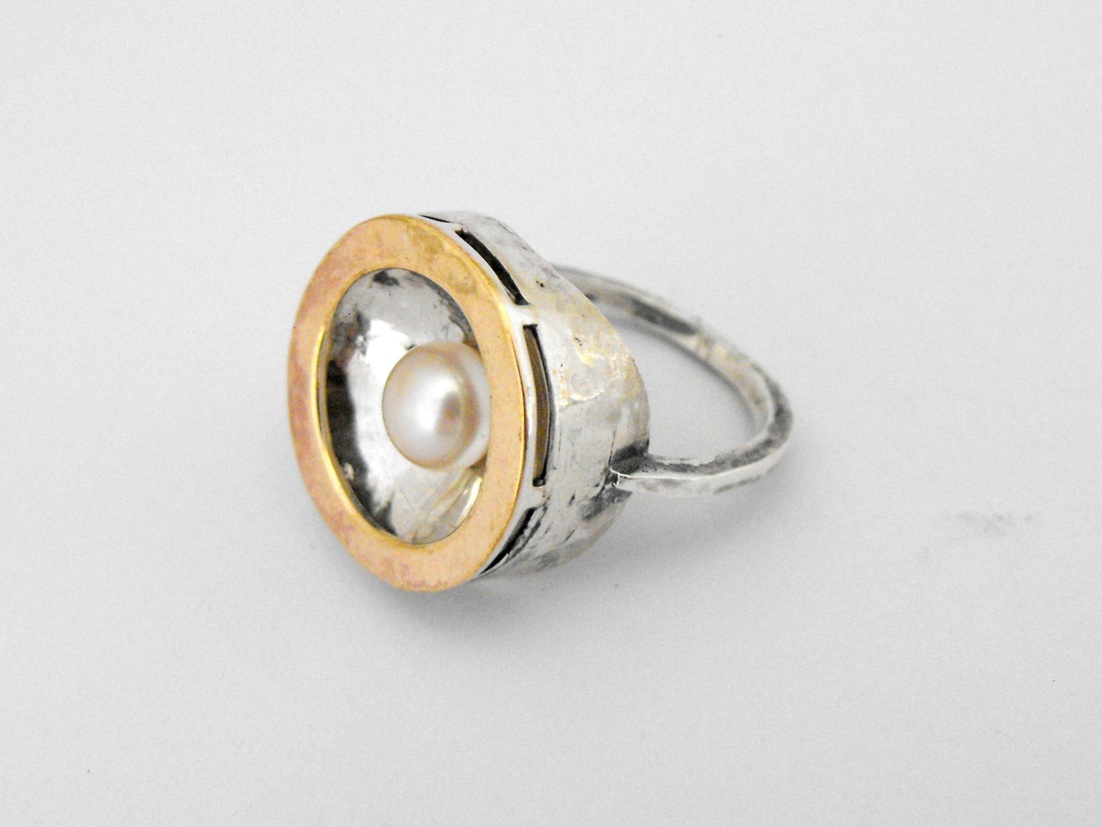 Inel realizat manual cu o rama aurie din gold filled. Caseta atipica cu textura realizata prin lovituri usoare de ciocan "ține captiva in adancime" o perla naturala. Sina inelului si partea exterioara a casetei este la fel texturata si putin patinata. Autentic si atemporal.