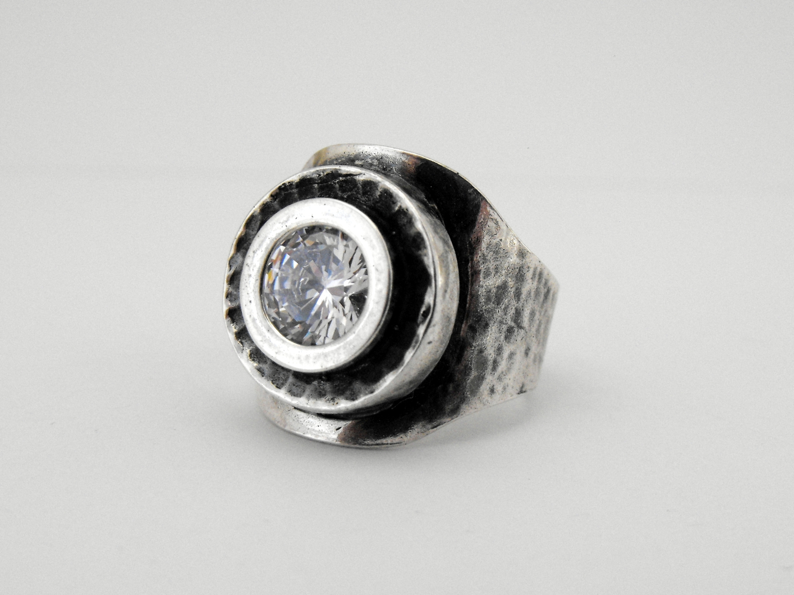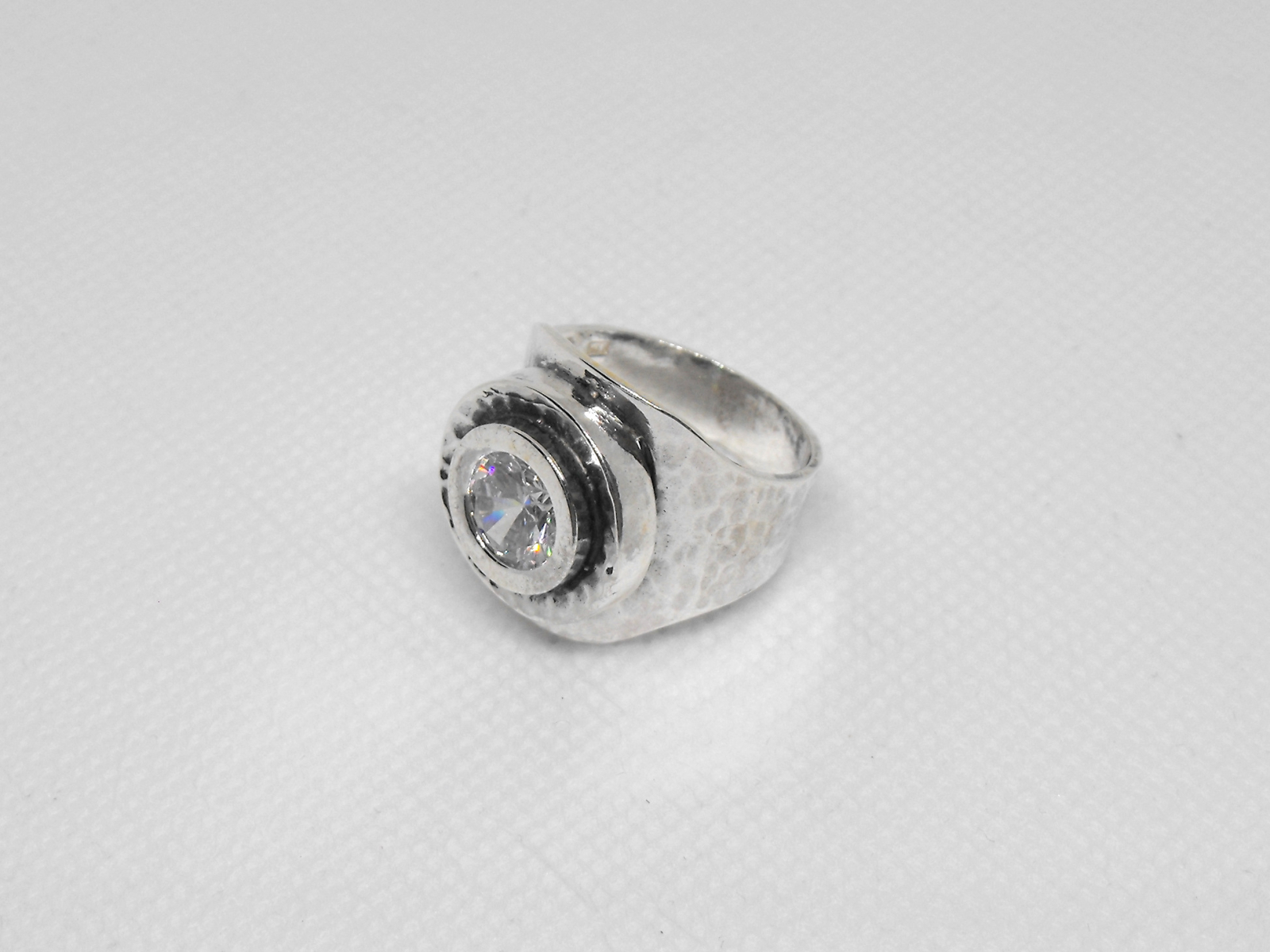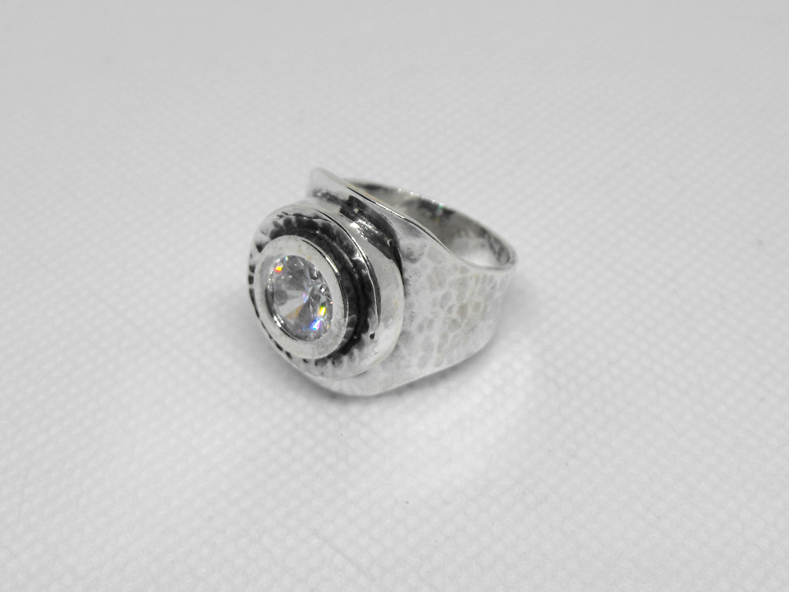 Inel din argint realizat manual. Caseta finisata in 2 texturi, partea exterioara cu tehnica loviturii de ciocan si patinata, iar partea interioara slefuita lucios scot in evidenta culoarea si luciul pietrei montate.La acest inel este montat CZ (Cubic Zirconia) transparent.