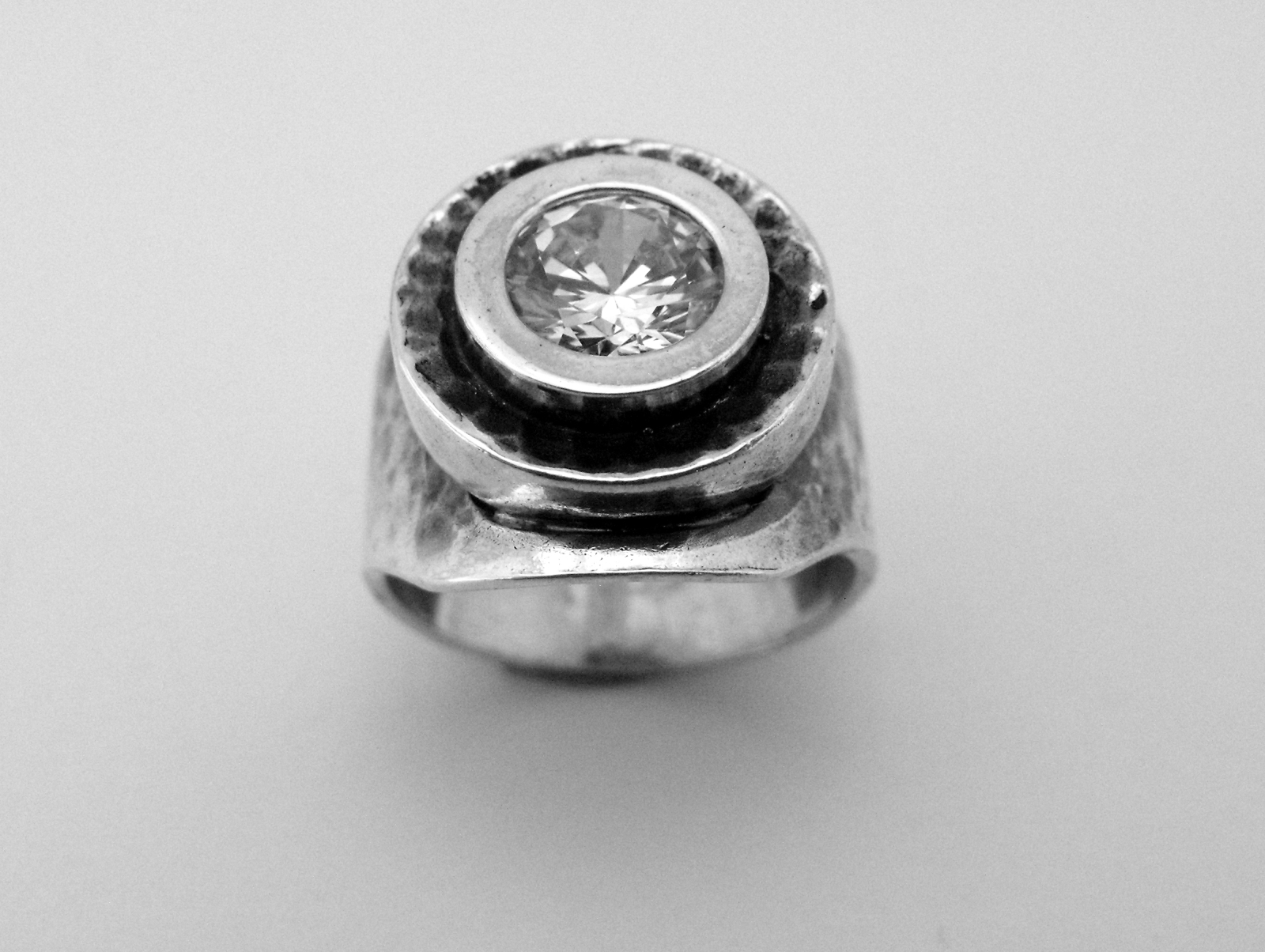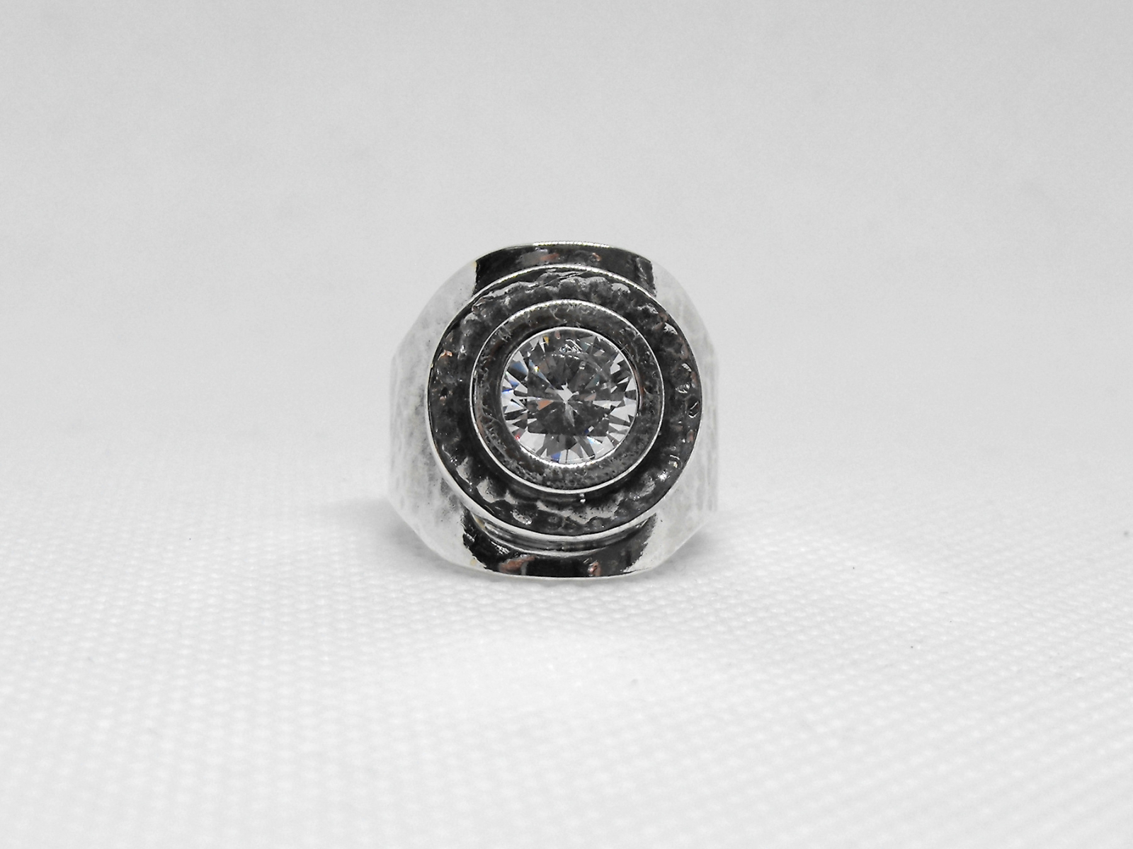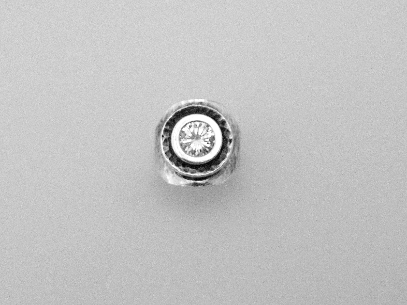 Inel din argint realizat manual. Caseta finisata in 2 texturi, partea exterioara cu tehnica loviturii de ciocan si patinata, iar partea interioara slefuita lucios scot in evidenta culoarea si luciul pietrei montate.La acest inel este montat CZ (Cubic Zirconia) transparent.