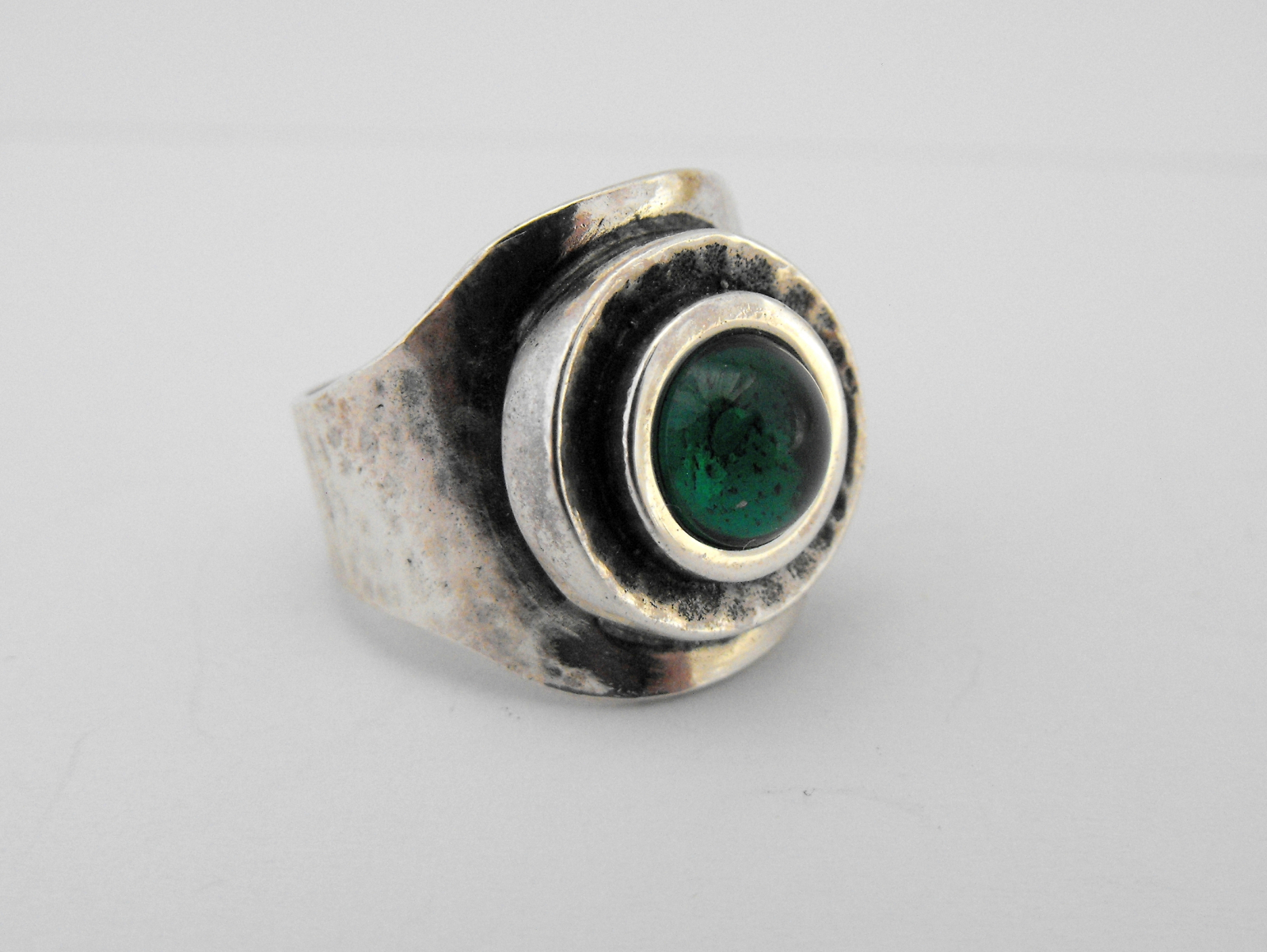 Inel din argint realizat manual. Caseta finisata in 2 texturi, partea exterioara cu tehnica loviturii de ciocan si patinata, iar partea interioara slefuita lucios scot in evidenta culoarea si luciul pietrei montate.La acest inel este montat CZ (Cubic Zirconia) caboson in culoare verde intens. Clasic si elegant.