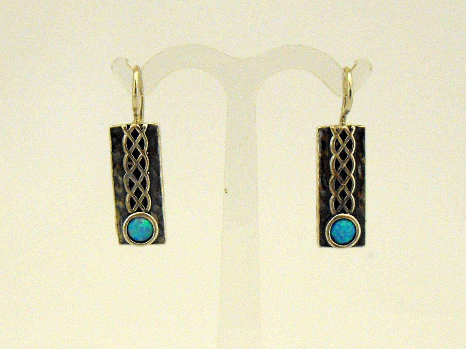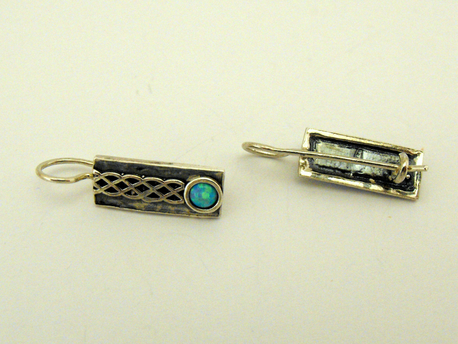 Cercei realizati manual din argint. Caseta cercelului este ornamentata cu o banda de argint impletita usor patinata si cu un opal de sinteza de diamentru 4 mm. La alegere, cerceii pot fi realizati cu oricare dintre pietrele semipretioase din imaginea alaturata.