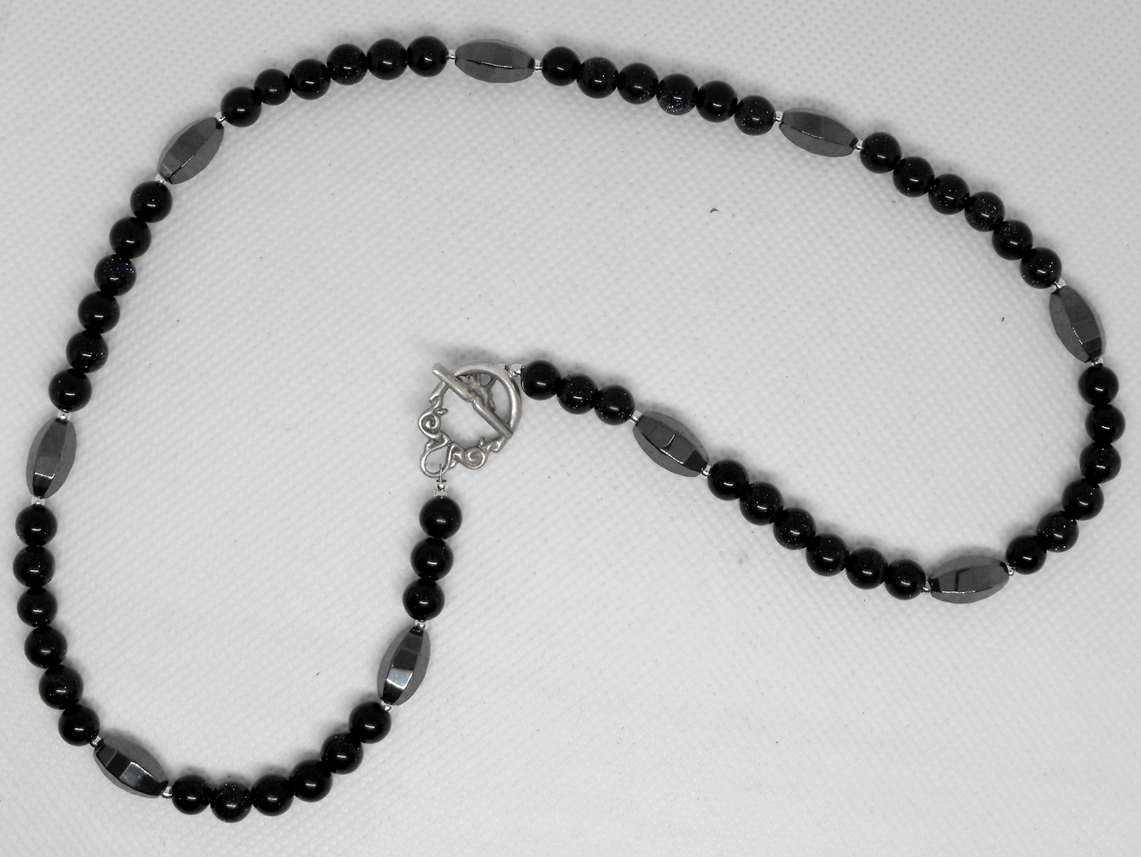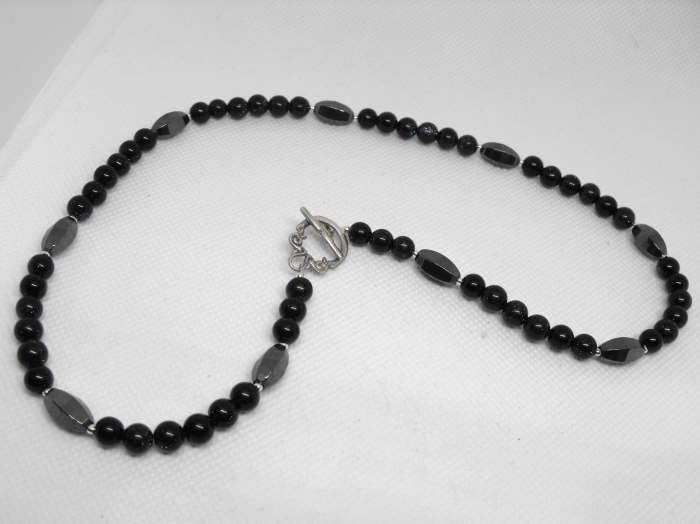 Colier UNICAT realizat din piatra soarelui albastra (bile de 6 mm) si hematit oval fatetat in culoare gri inchis cu inchizatoare ornamentala din argint. Piatra soarelui albastra este un tip de sticla tratata cu microsfere de cupru care dupa finisare ii confera acea stralucire caracteristica. Desi nu este o piatra care se formeaza in mod natural, piatra soarelui albastra este bine integrata de cristaloterapeuti. Hematitul este un mineral care slefuit capata un luciu uimitor. In cristaloterapie se spune ca hematitul are o capacitate extraordinara de a absorbi energiile negative. Este elegant fara a exagera impresia vizuala.