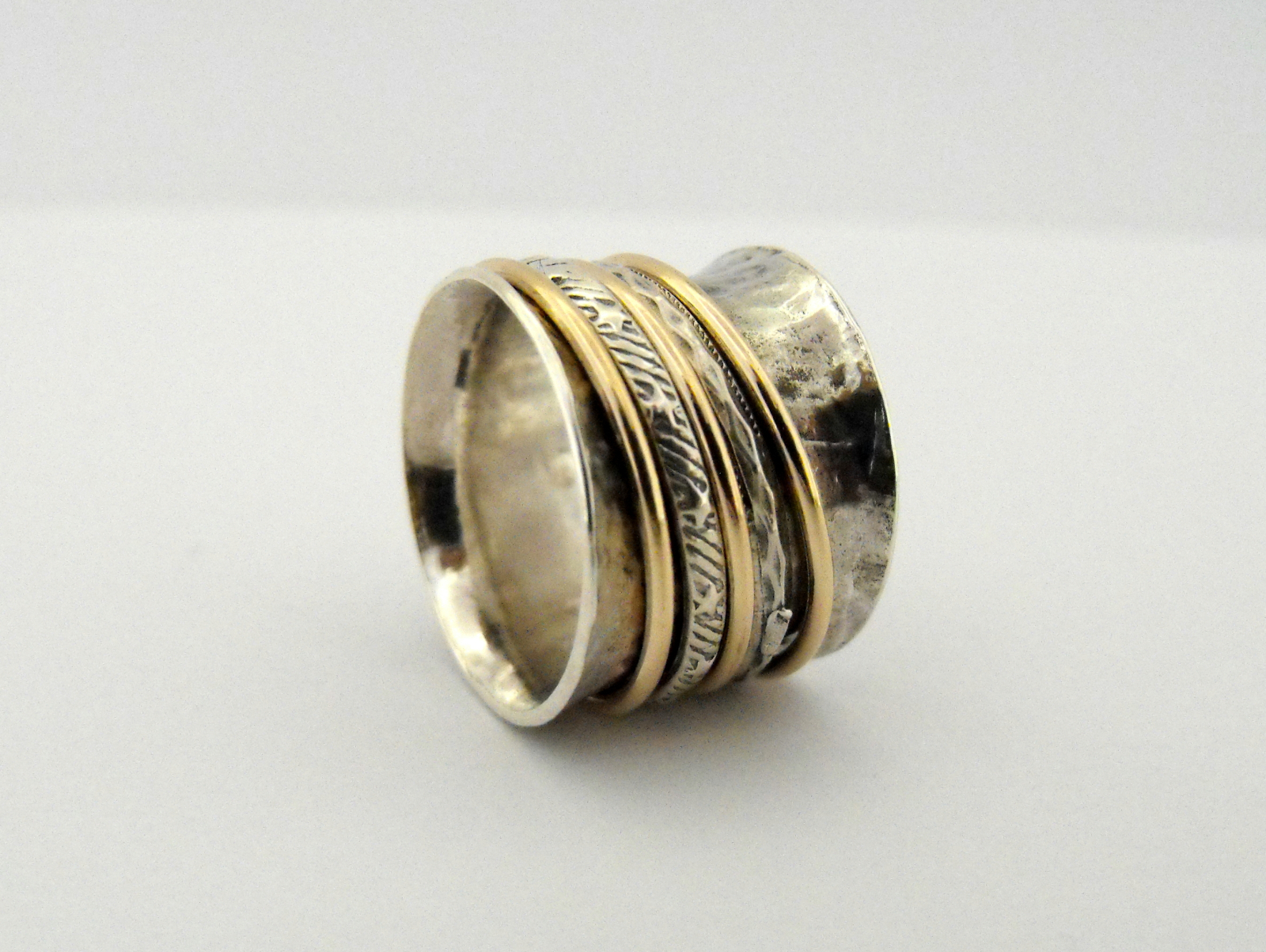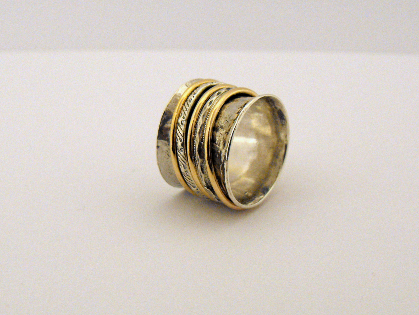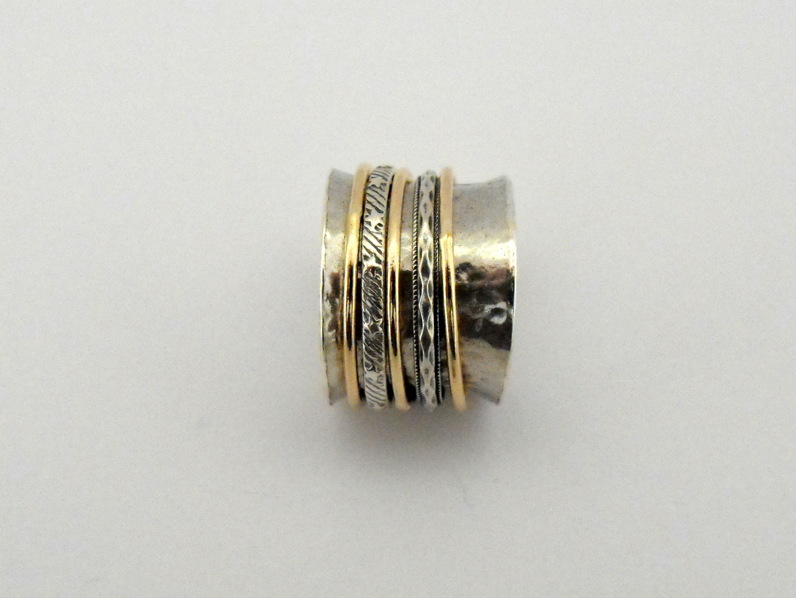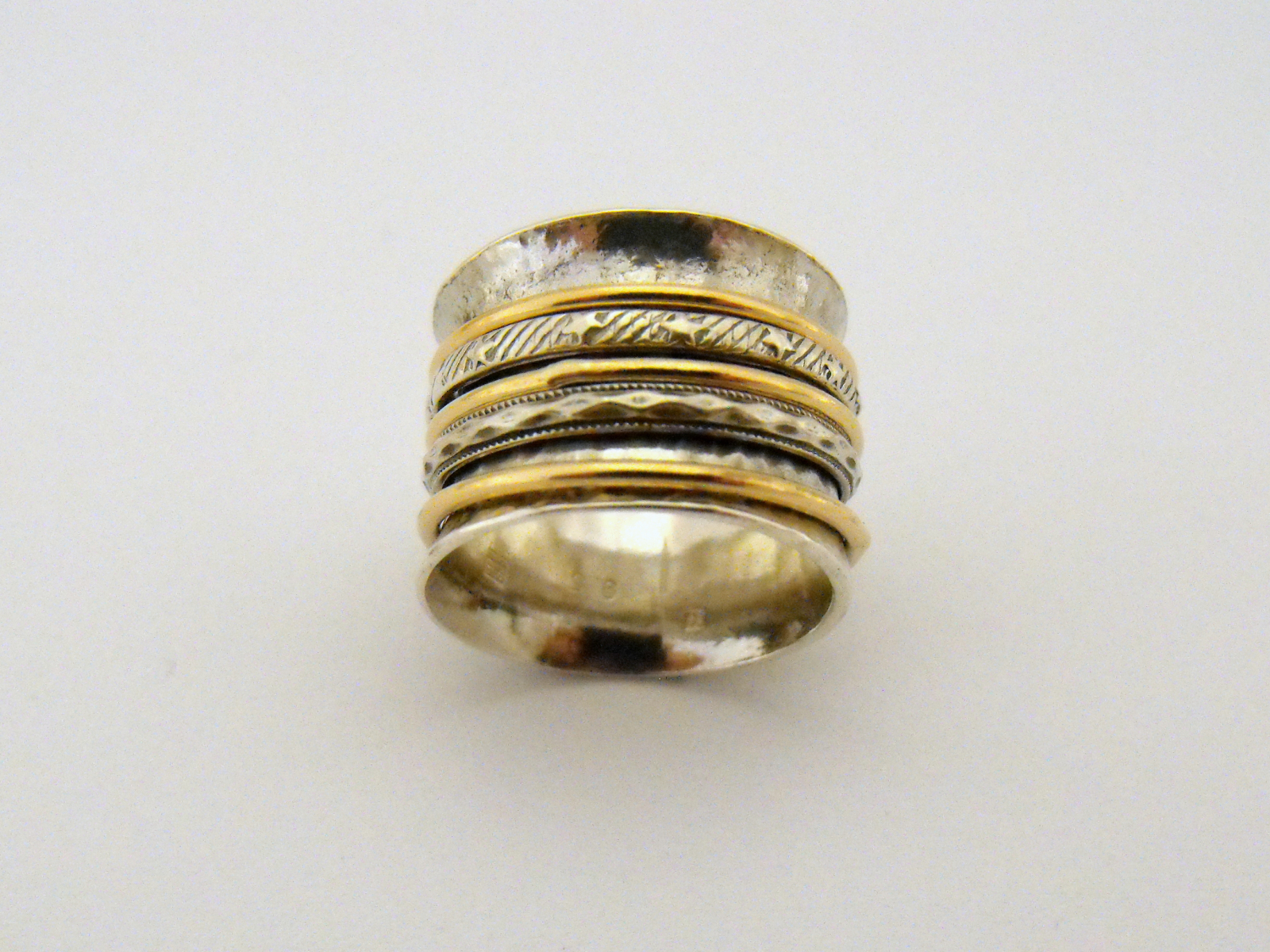 Inelrealizat manual,  bogat ornamentat cu 5 inele rotative din argint si gold filled inetrcalate . Cele 2 inele rotative din argint au ornamente diferite.