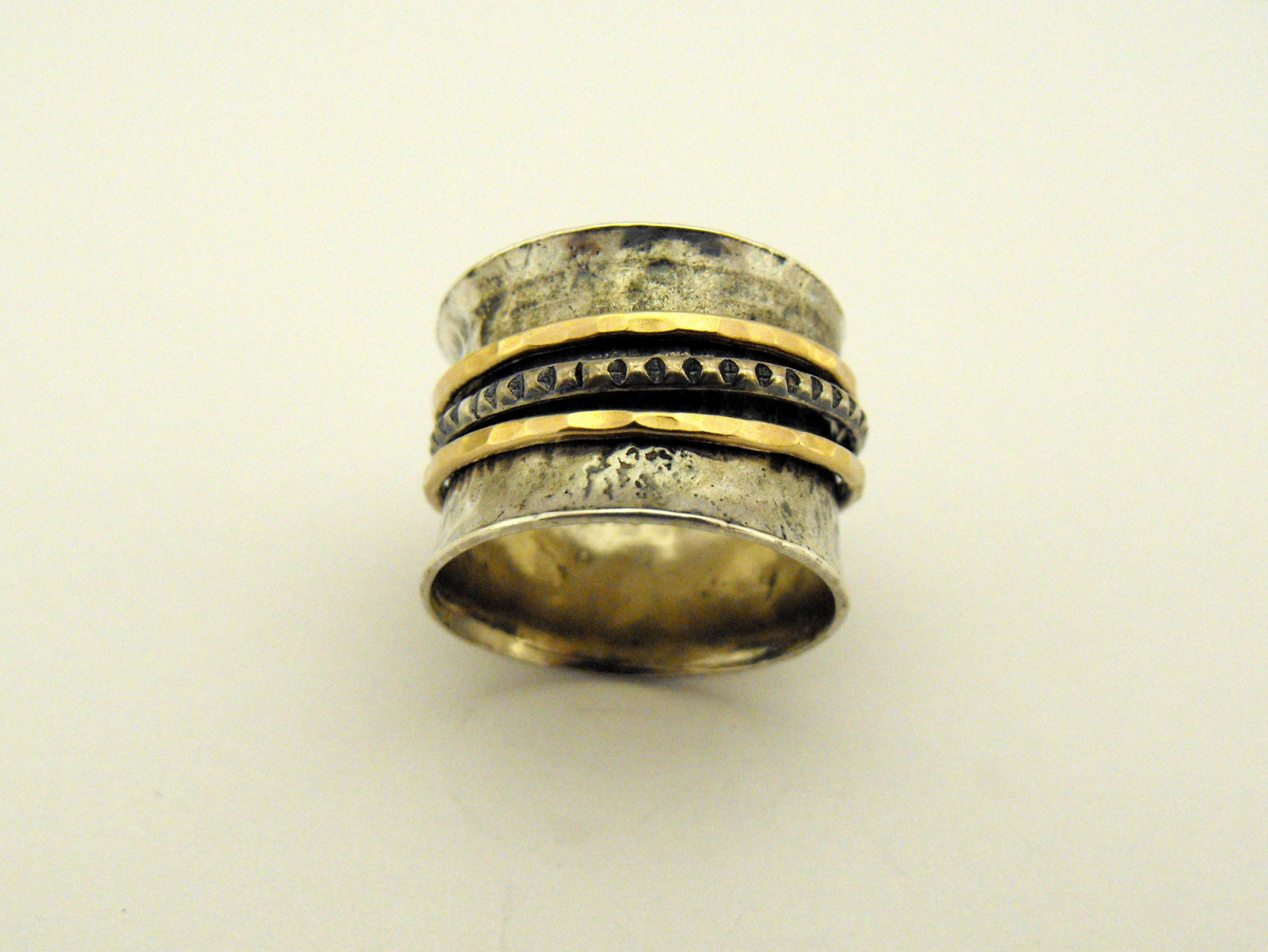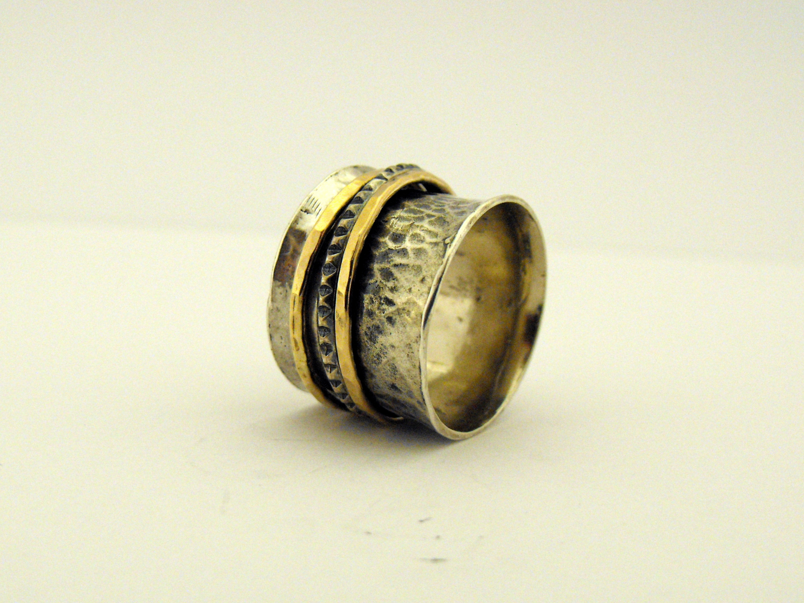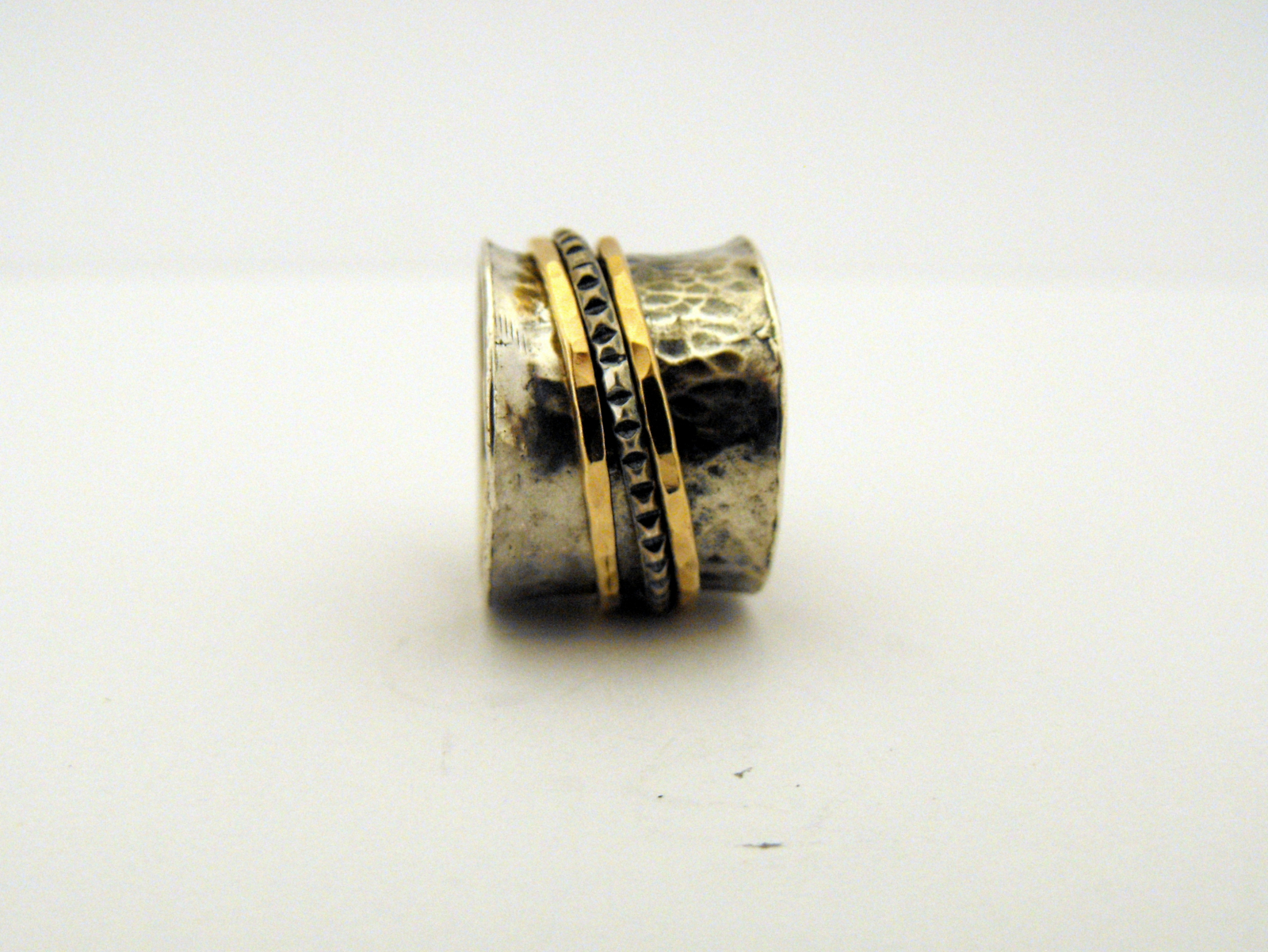 Inel moving cu baza din argint cu asoect ciocanit cu 3 inele rotitoare subtiri: 2 din gold filled si una din argint. Toate componentele din argint sunt usor oxidate pentru un aspect vintage.