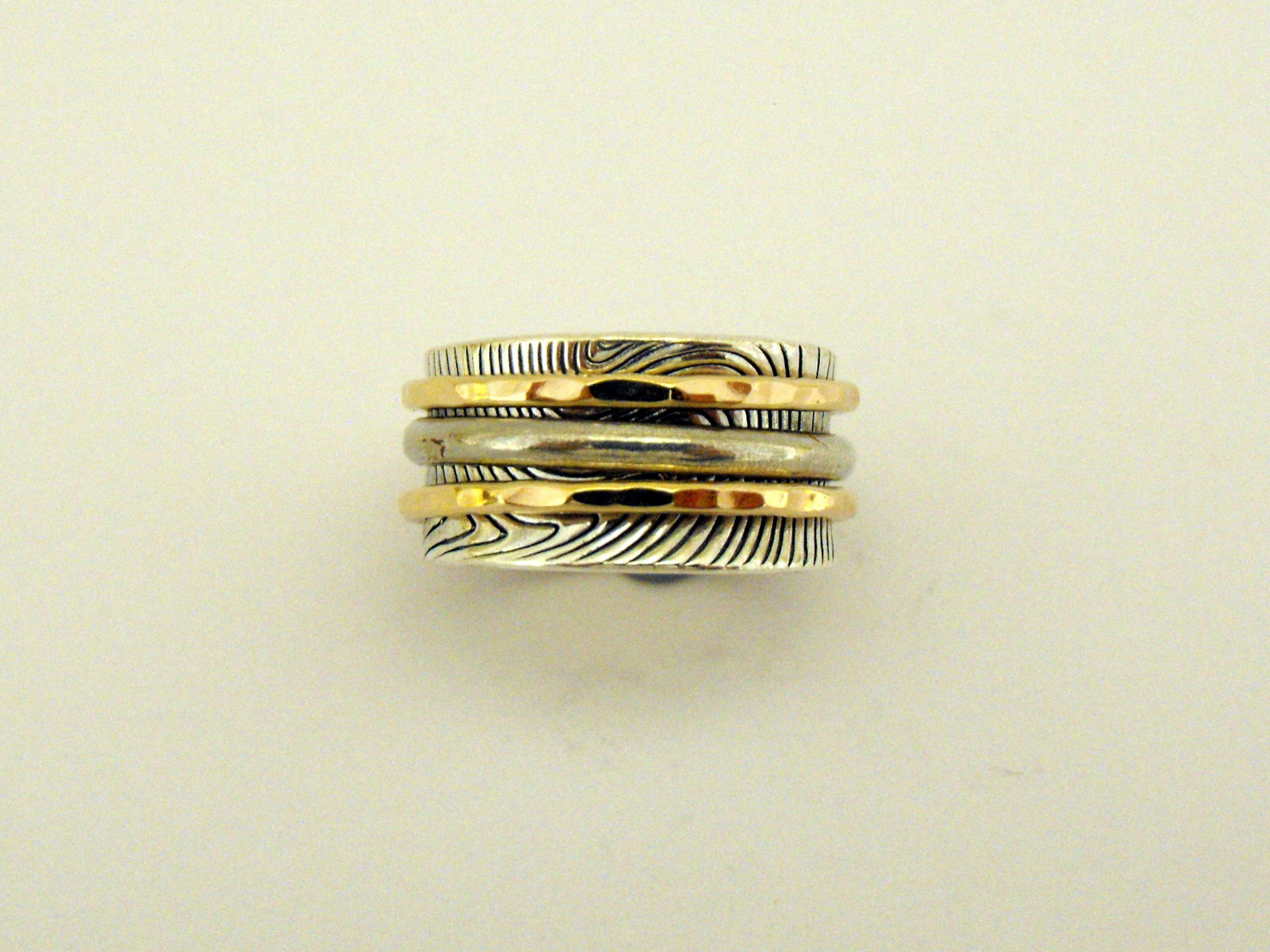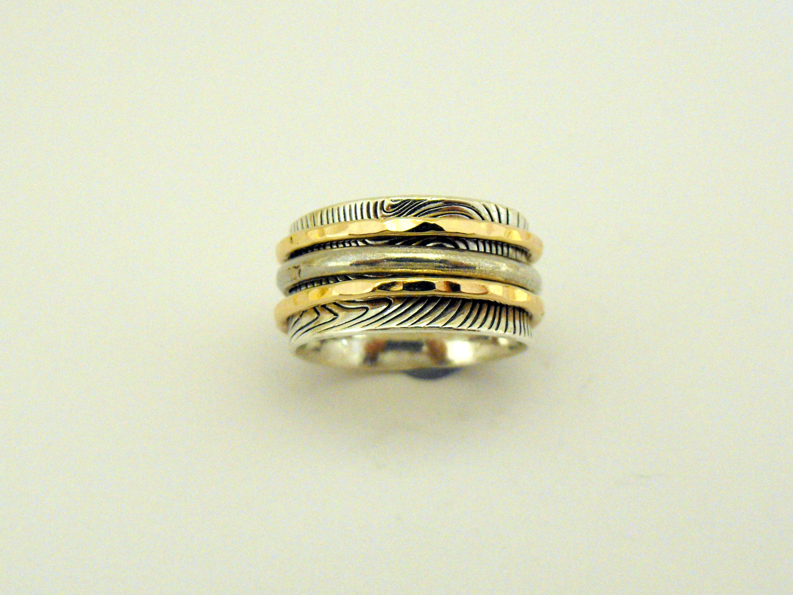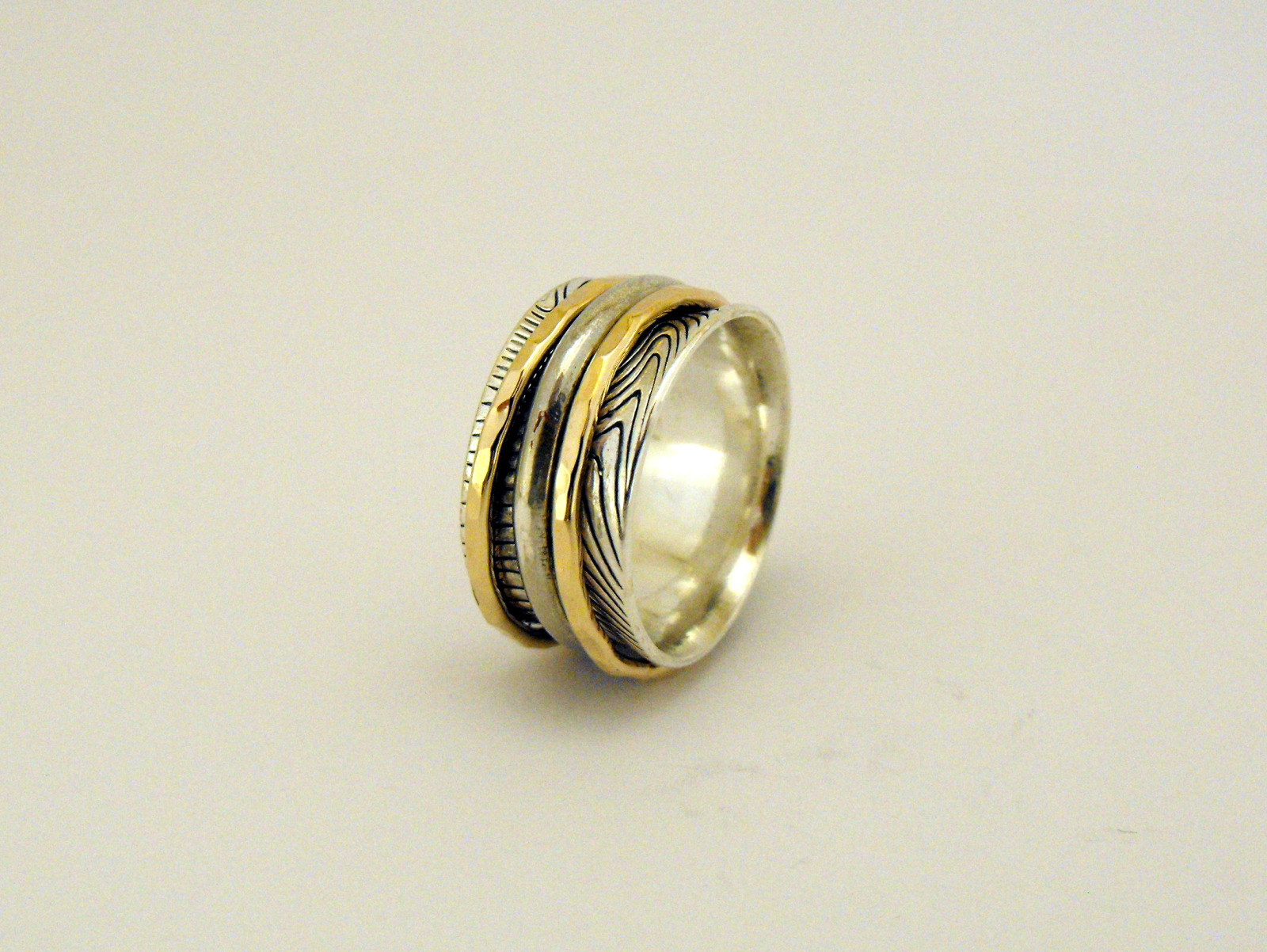 Inel moving unisex lucrat manual. Versatilitatea acestui inel vine de la combinatia de texturi si culori. Poate fi la fel de potrivit a fi purtat ca si inel sau ca si verigheta.