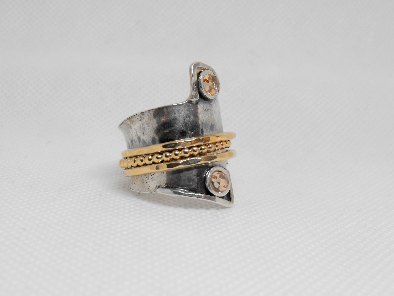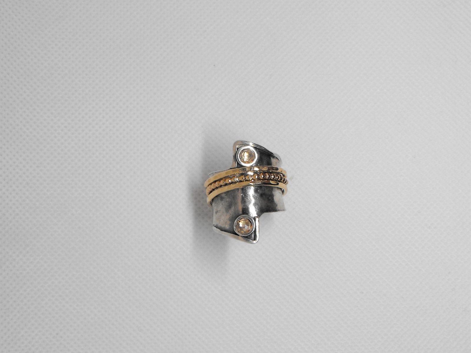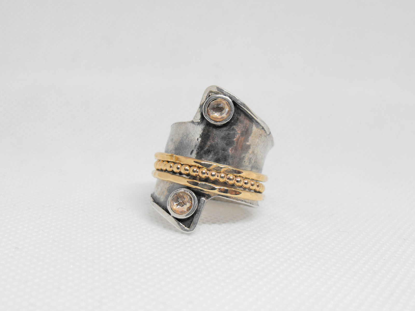 Inel moving realizat manual.Inel cu design asimetric, ornamentat cu 2 cristale in ton cu cele 3 verigi rotitoare din gold filled. Prin designul lui, acest inel "imbraca" degetul pe care il porti, fiind in acelasi timp foarte comod la purtare datorita sinei ingustate inspre palma.