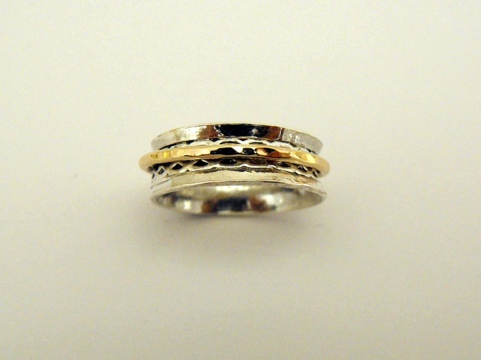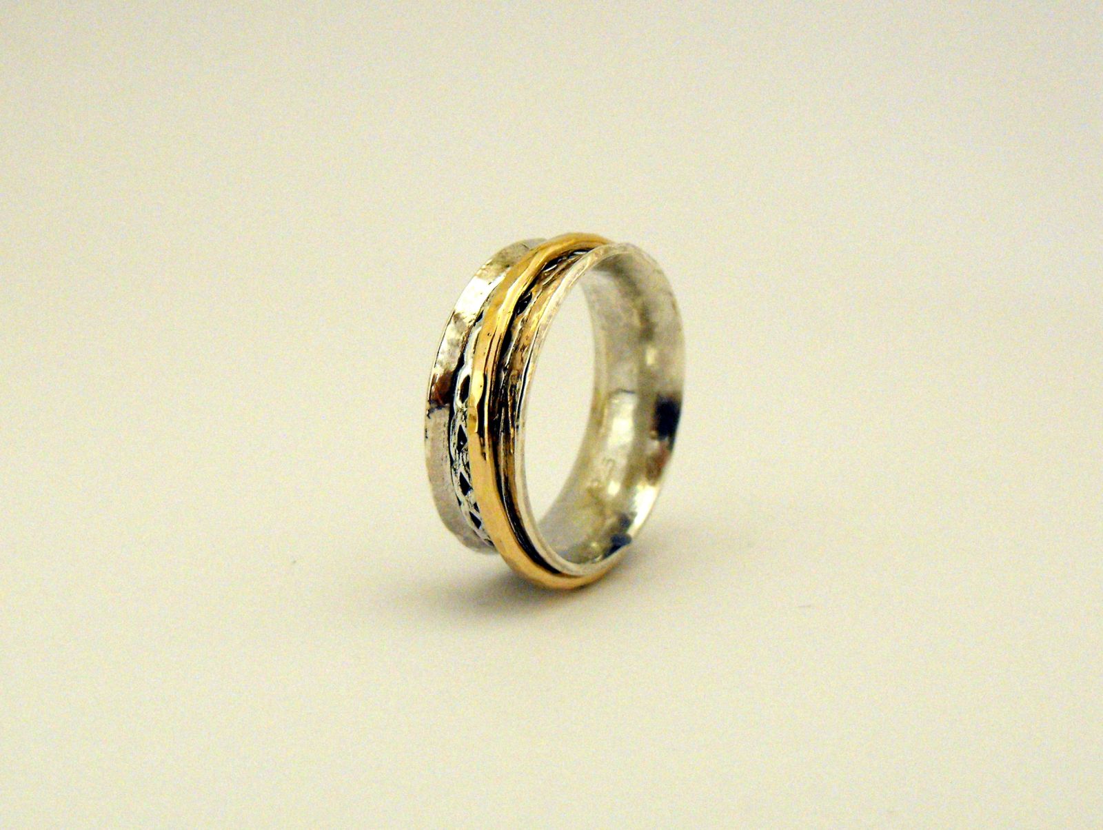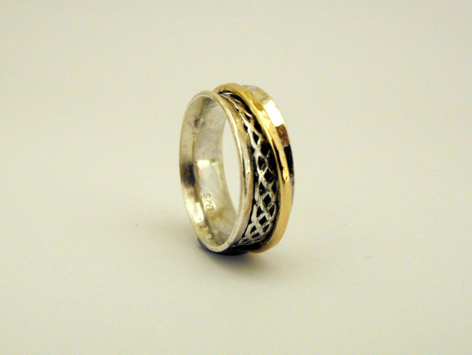 Inel moving unisex realizat manual. Pe baza inelului este aplicata o banda cu model impletit, oxidata pentru a crea imaginea de volum impreuna cu veriga rotitoare din gold filled.Designul acestui inel il face potrivit si pentru a fi purtat ca verigheta.