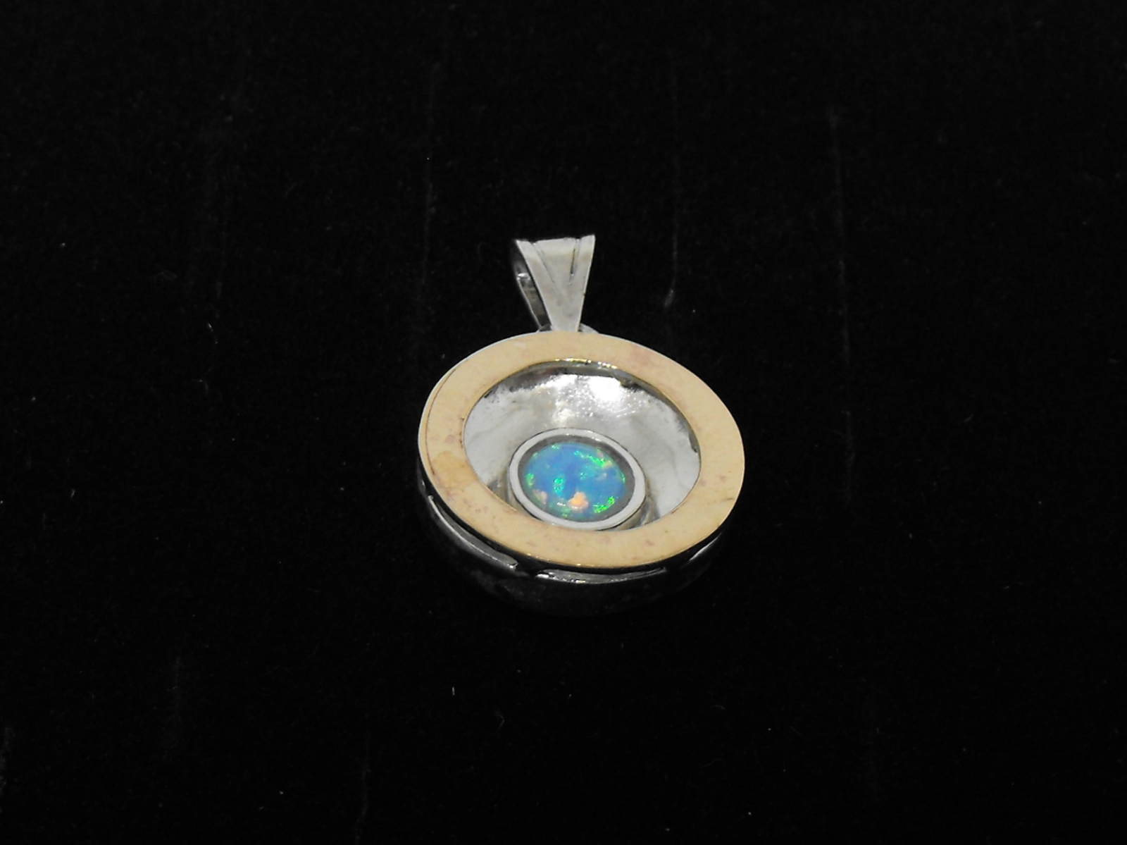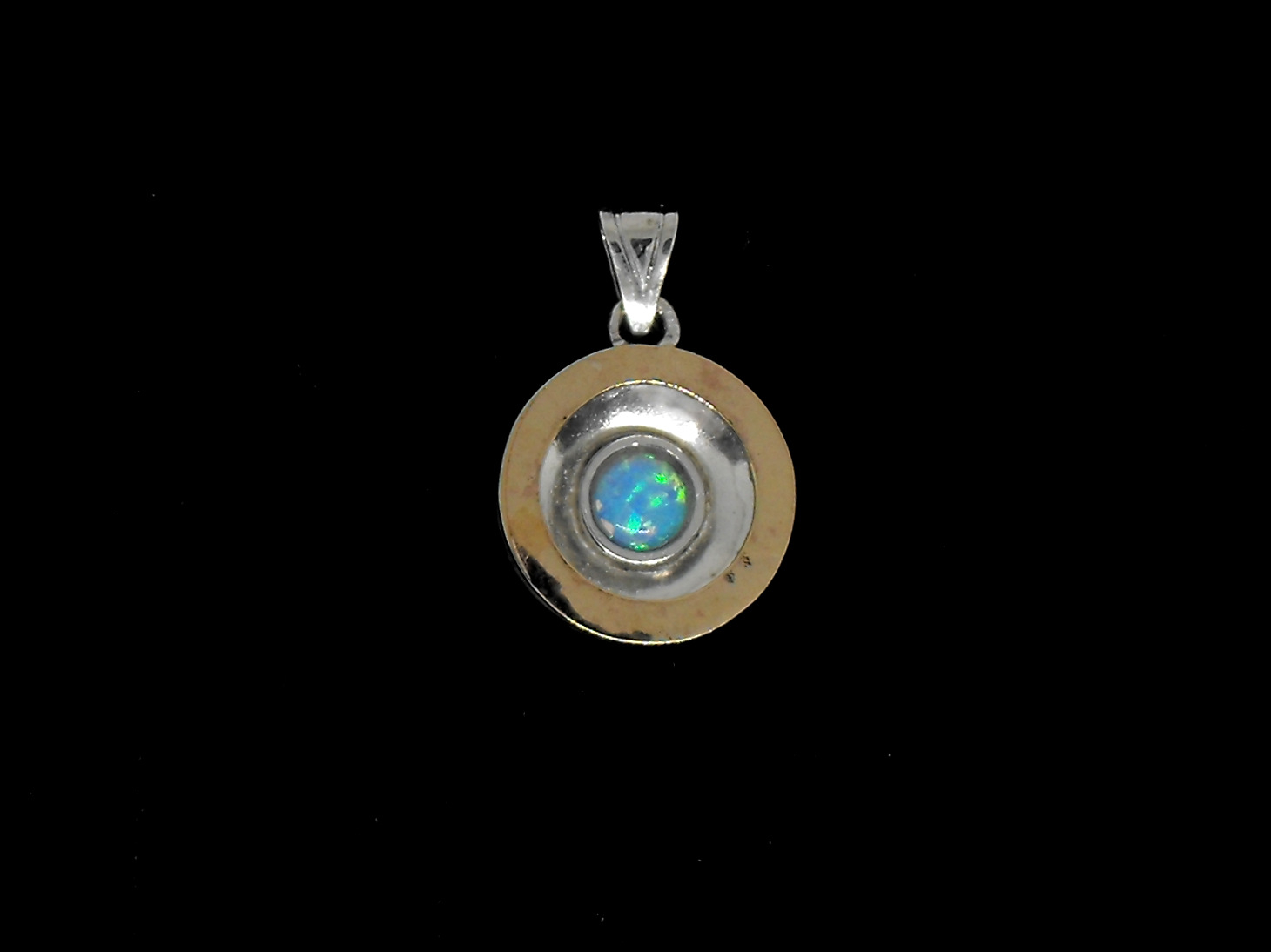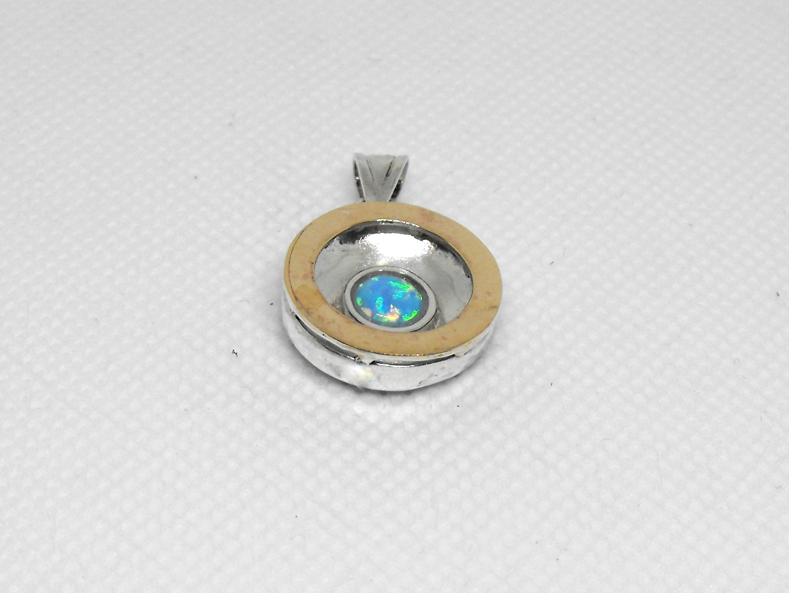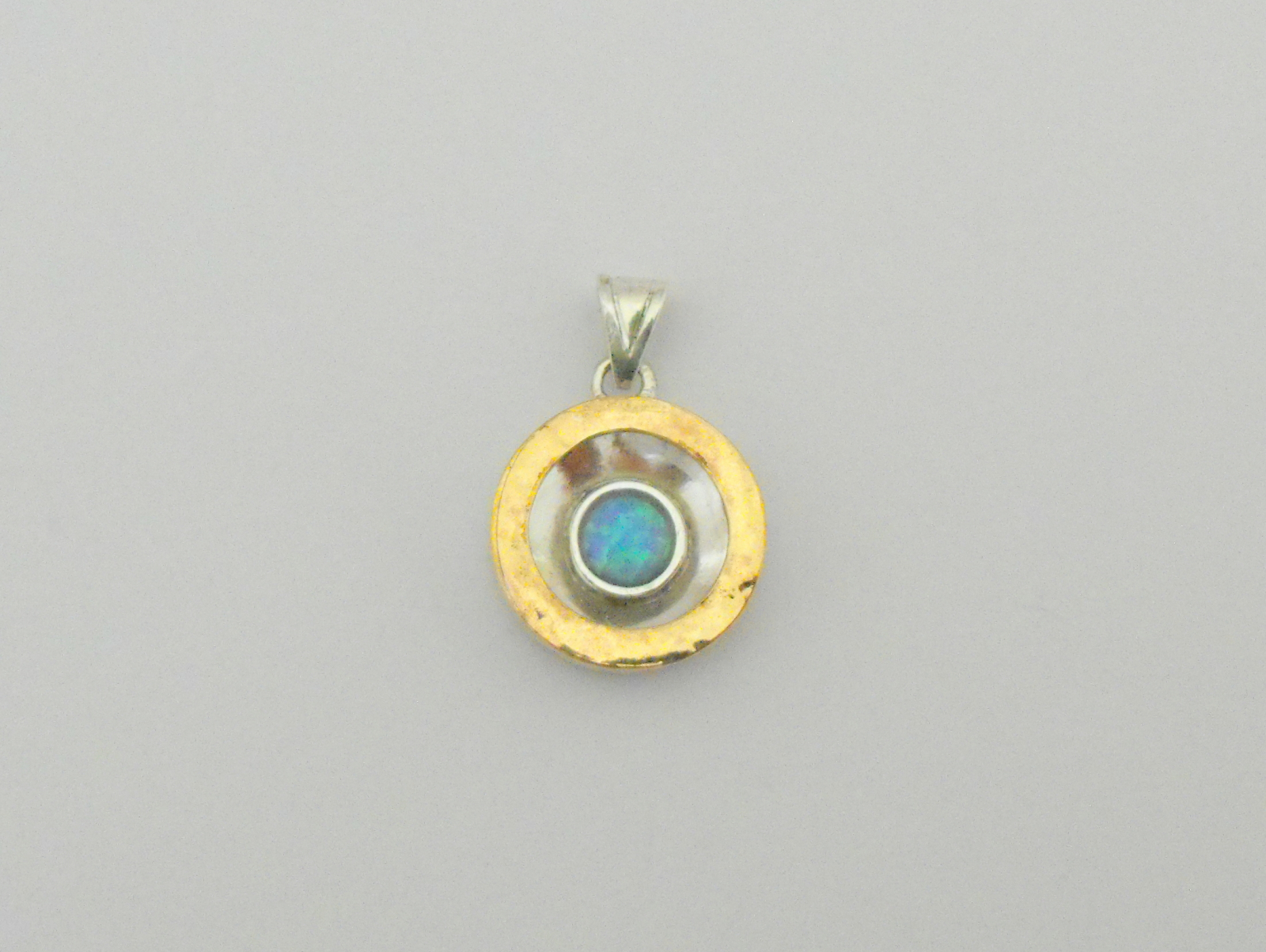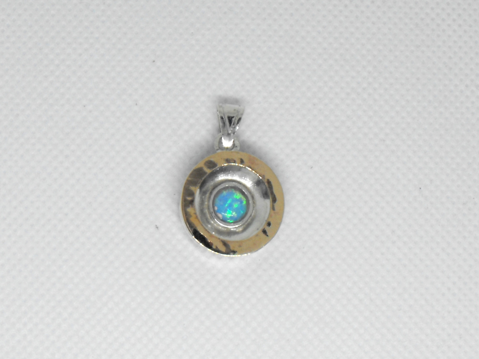 Pandant realizat manual din argint si gold filled. Caseta atipica cu textura realizata prin lovituri usoare de ciocan "ține captiv in adancime" un opal de sinteza. Se poate alcatui un set cu inelul 90143 si cerceii 90243.