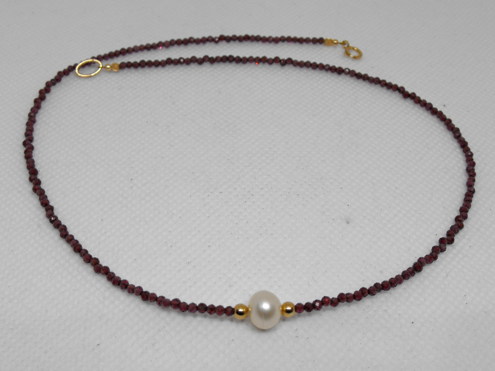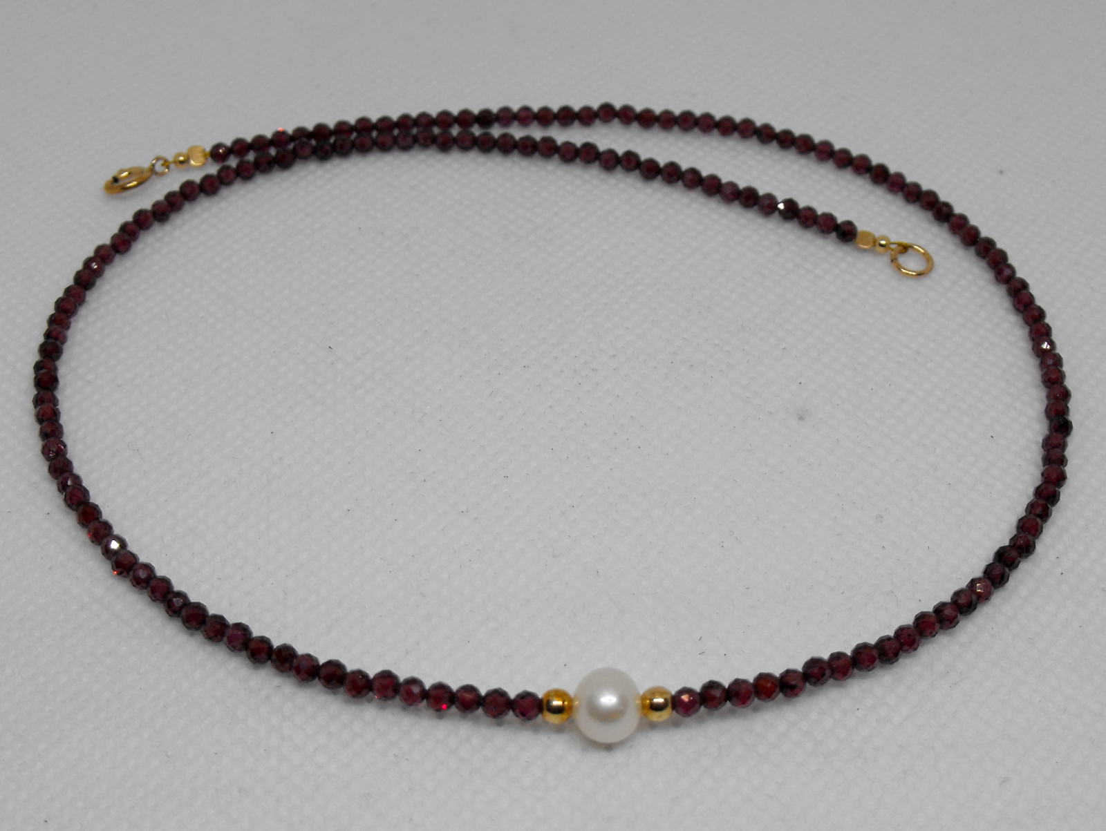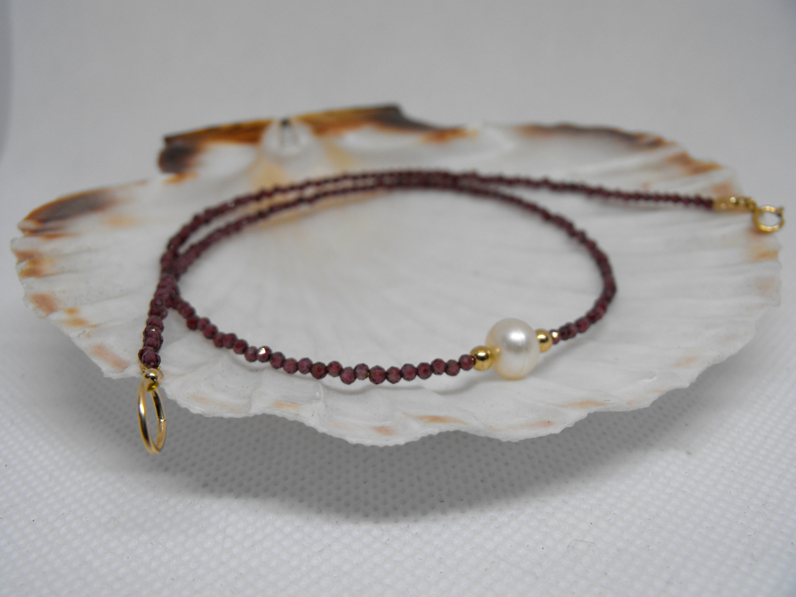 Colier fin, subtire si delicat realizat din bile fatetate granat almandin, cu o culoare profunda si luciu intens. In centru, o perla naturala alba rotunda incadrata de bile din gold filled adauga un accent captivant. Contrastul cromatic si de textura dintre granatele fine si perla rotunda alba confera o nota de individualitate, ideala pentru a sublinia stilul personal.Granatul simbolizeaza energia vitala și pasiunea pe care. Purtând bijuterii din granat, nu doar te bucuri de frumusețea lor estetică, ci și de puterea lor de a stimula voința, curajul și încrederea în sine.Granatul amplifică ceea ce există deja în interiorul omului – curajul care așteaptă să fie activat, vitalitatea care caută o direcție, focul interior care poate fi uneori înăbușit de stres, îndoială sau oboseală.