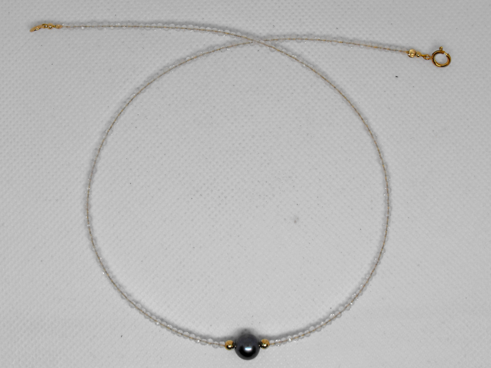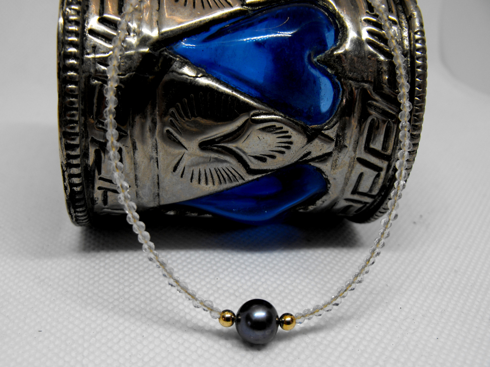 Colier fin, subtire si delicat realizat din bile fatetate de quartz, cu transparenta si luciu discret. In centru, o perla naturala rotunda de culoare gri inchis, incadrata de bile din gold filled adauga un accent captivant. Contrastul cromatic si de textura dintre quartzul fatetat si perla rotunda alba confera o nota de individualitate, ideala pentru a sublinia stilul personal. Quartzul este piatra claritatii , a directiei. Quartzul invită la adancime, la sinceritate, la aliniere intre gand, inima si actiune.