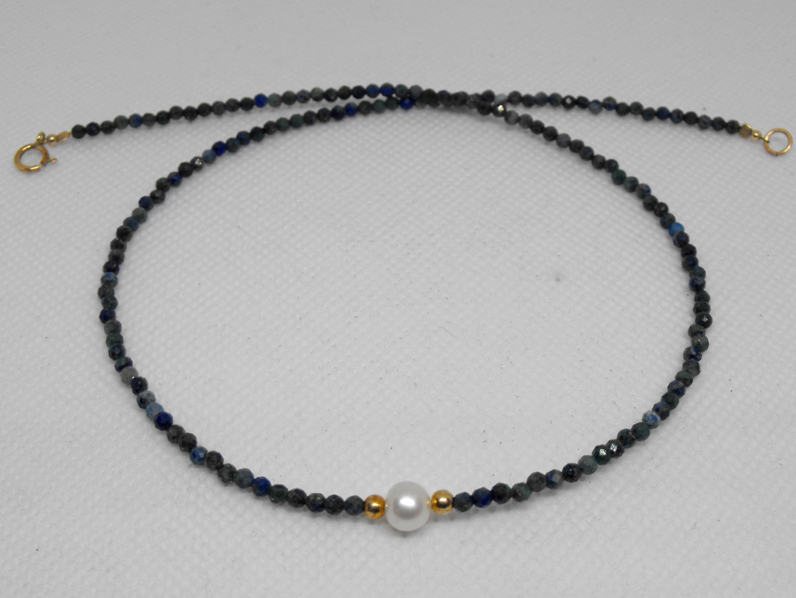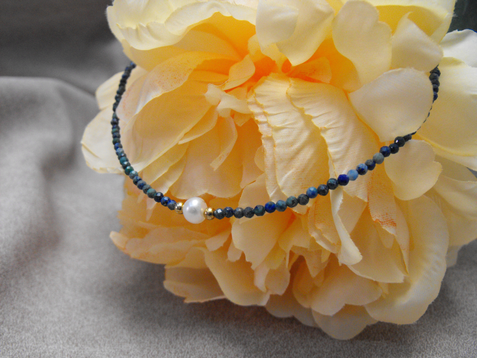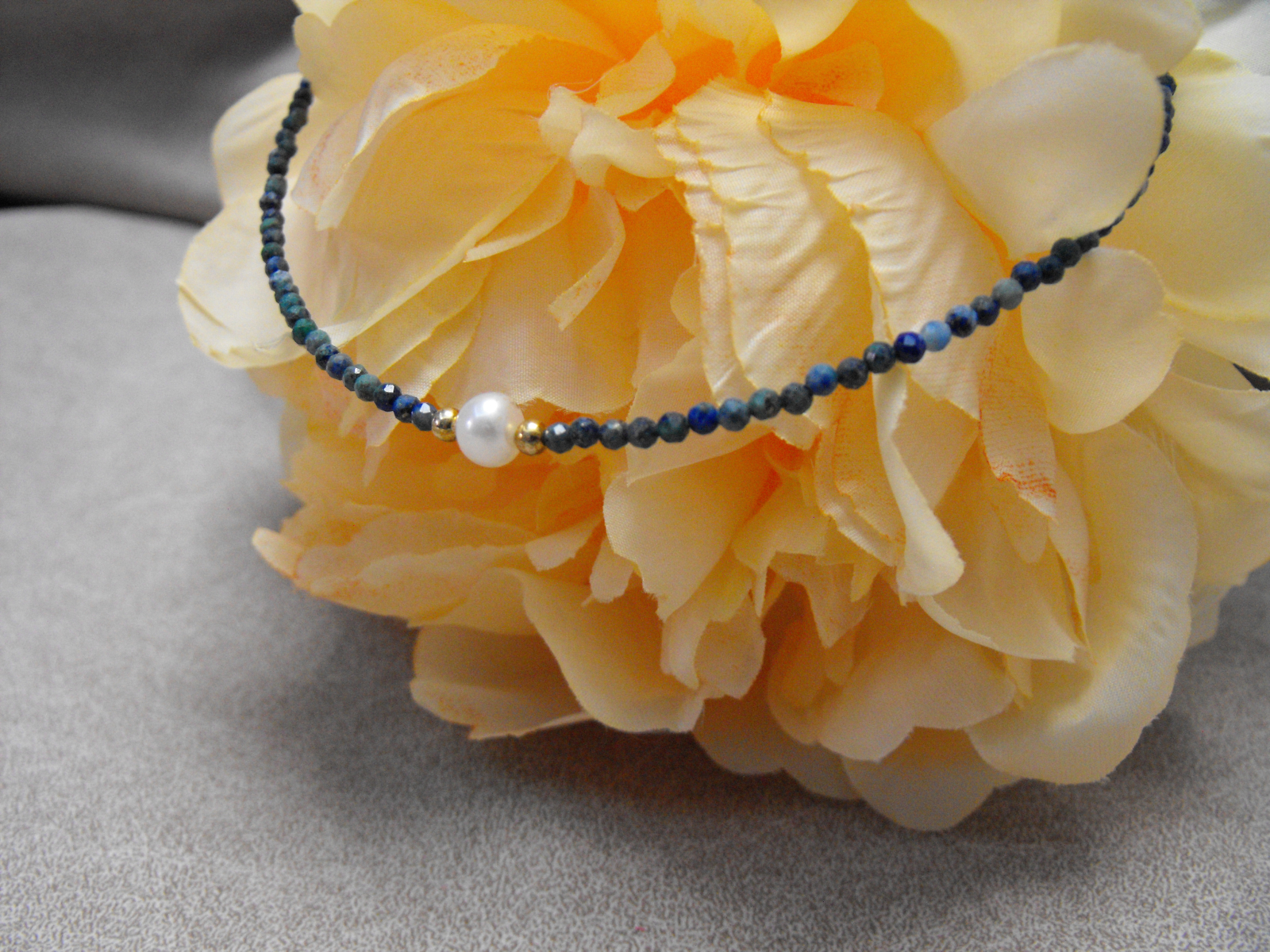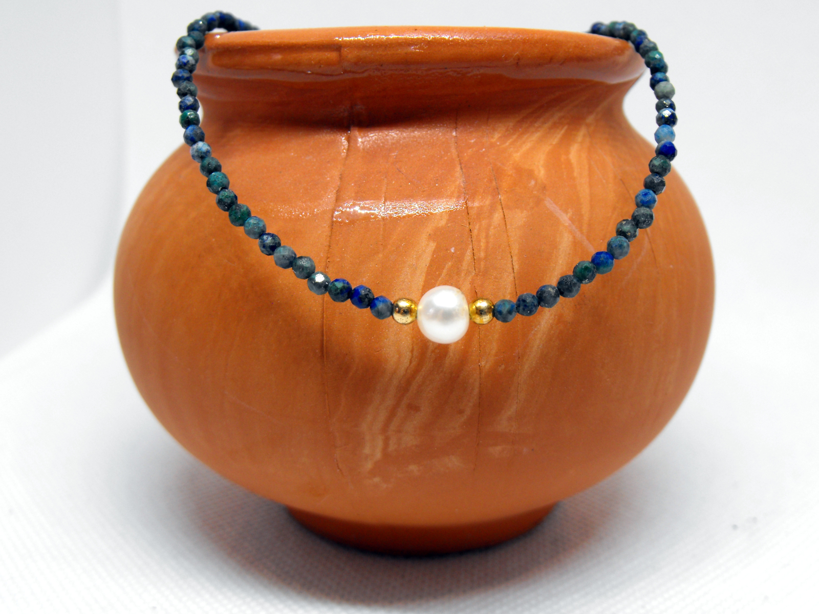 Colier fin, subtire si delicat realizat din bile fatetate de crisocol, in nuante de albastru si vede-mare adanca si padure acvatica. In centru, o perla naturala alba  rotunda incadrata de bile din gold filled adauga un accent captivant. Contrastul cromatic si de textura dintre crisocolul fatetat si perla rotunda alba confera o nota de individualitate, ideala pentru a sublinia stilul personal.Crisocolul asociat cu energia feminina sacra si este cunoscut pentru proprietatile sale calmante de echilibrare emotionala si de imbunatatire a comunicarii.El ne învață că vindecarea nu vine din forță, ci din deschidere, că vocea devine autentică doar atunci când se aliniază cu inima, iar energia feminină nu este fragilitate, ci o putere blândă,  capabilă să transforme orice spațiu în care este primită.