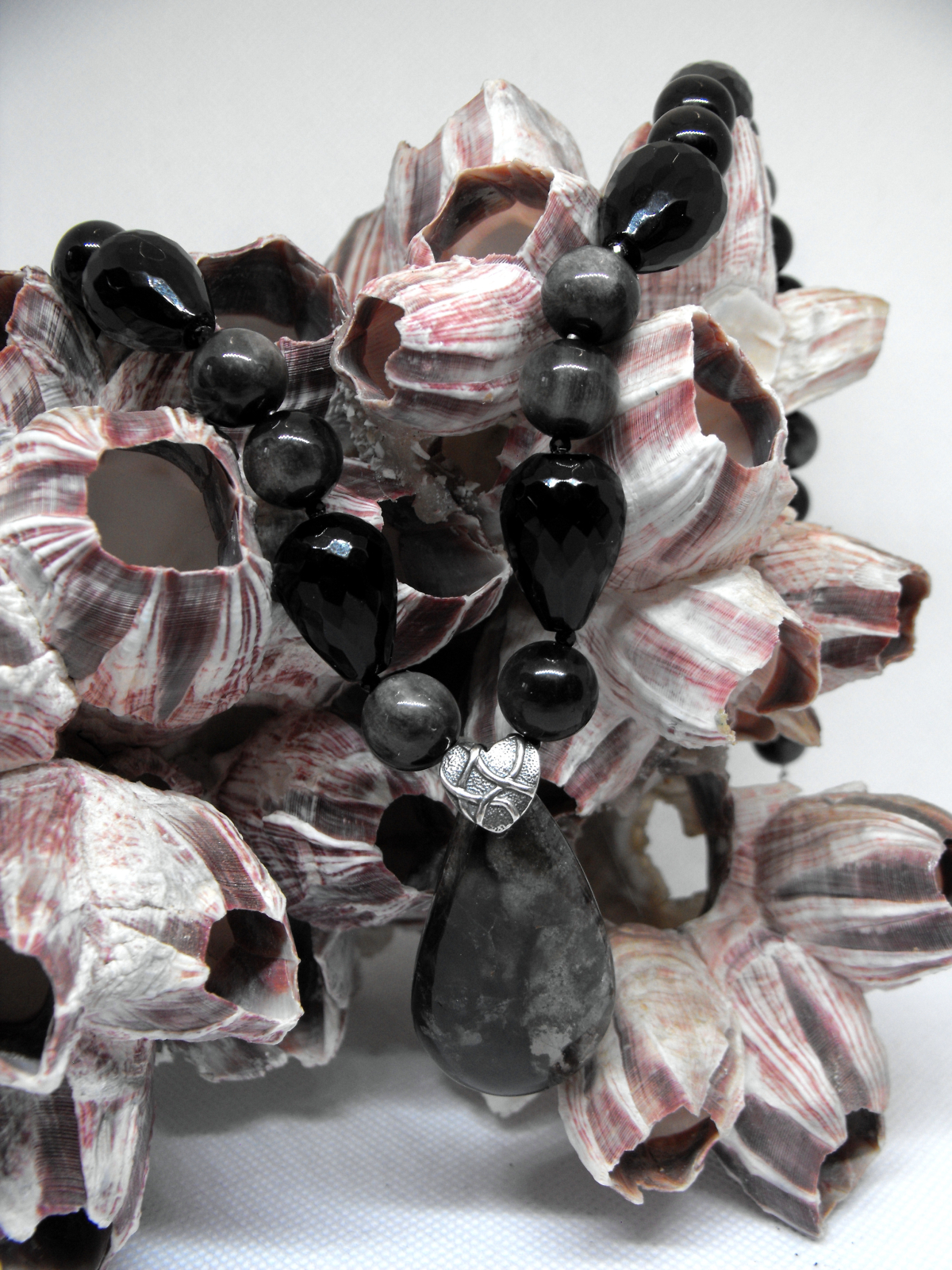 Colier UNICAT realizat printr-o combinatie de pietre: bile din obsidian, onix fatetat in forma de picatura si pandant din agat cu textura  organica.Obsidianul nu reflecta lumina, ci o absoarbe, nu straluceste la suprafata, ci in adancime, cristaloterapeutii il considera "piatra claritatii absolute".Piesa moderna, structurata si neconventionala, aduce un plus de autenticitate si inspiratie fiecarei tinute.