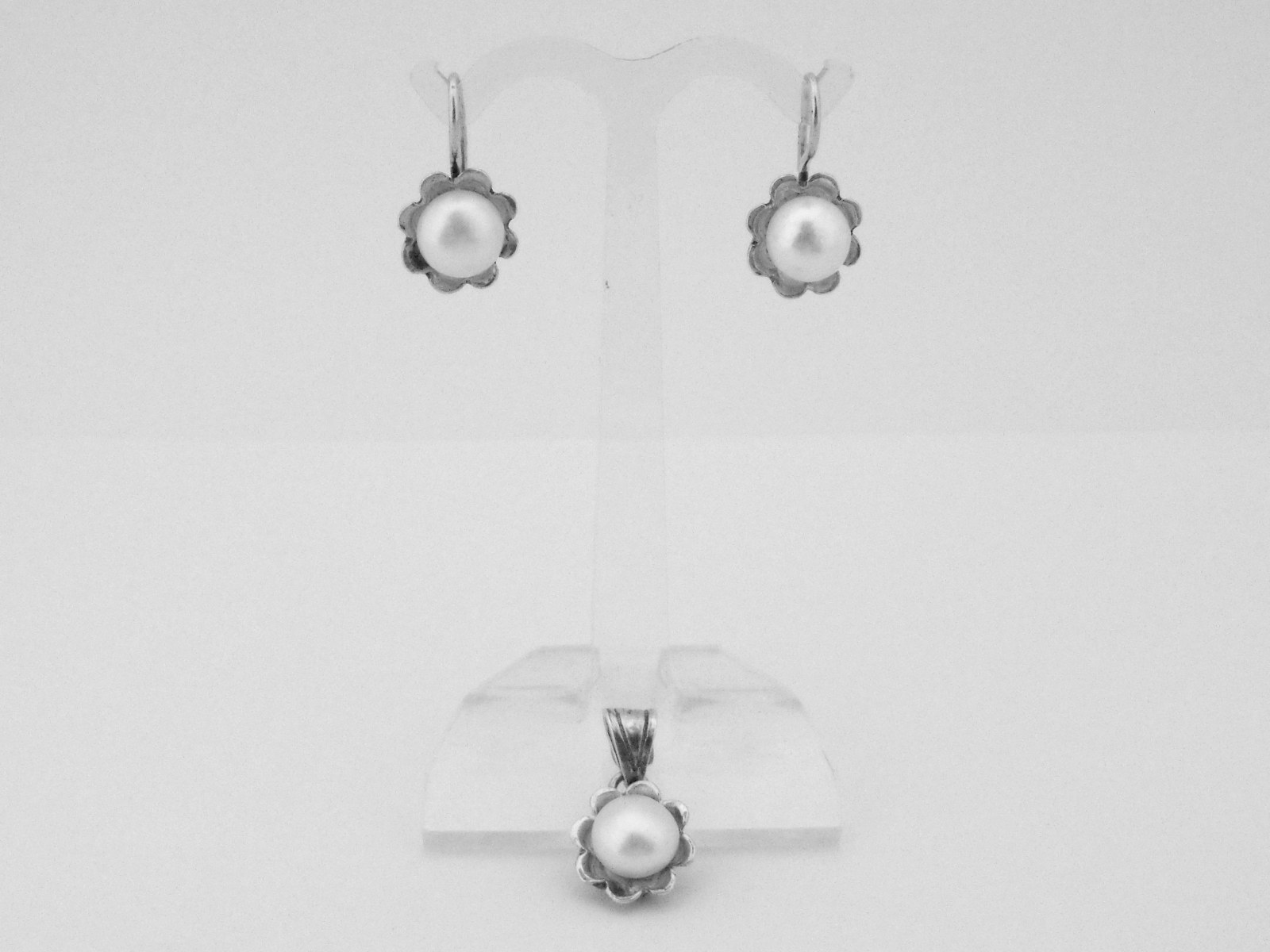 Set realizat manual din argint format din cercei si pandant Caseta in forma de floare este usor patinata pentru a crea un contrast si a pune in valoare perla naturala montata. Diametru casetei este de 11 mm iar perla naturla are 8 mm diametru.